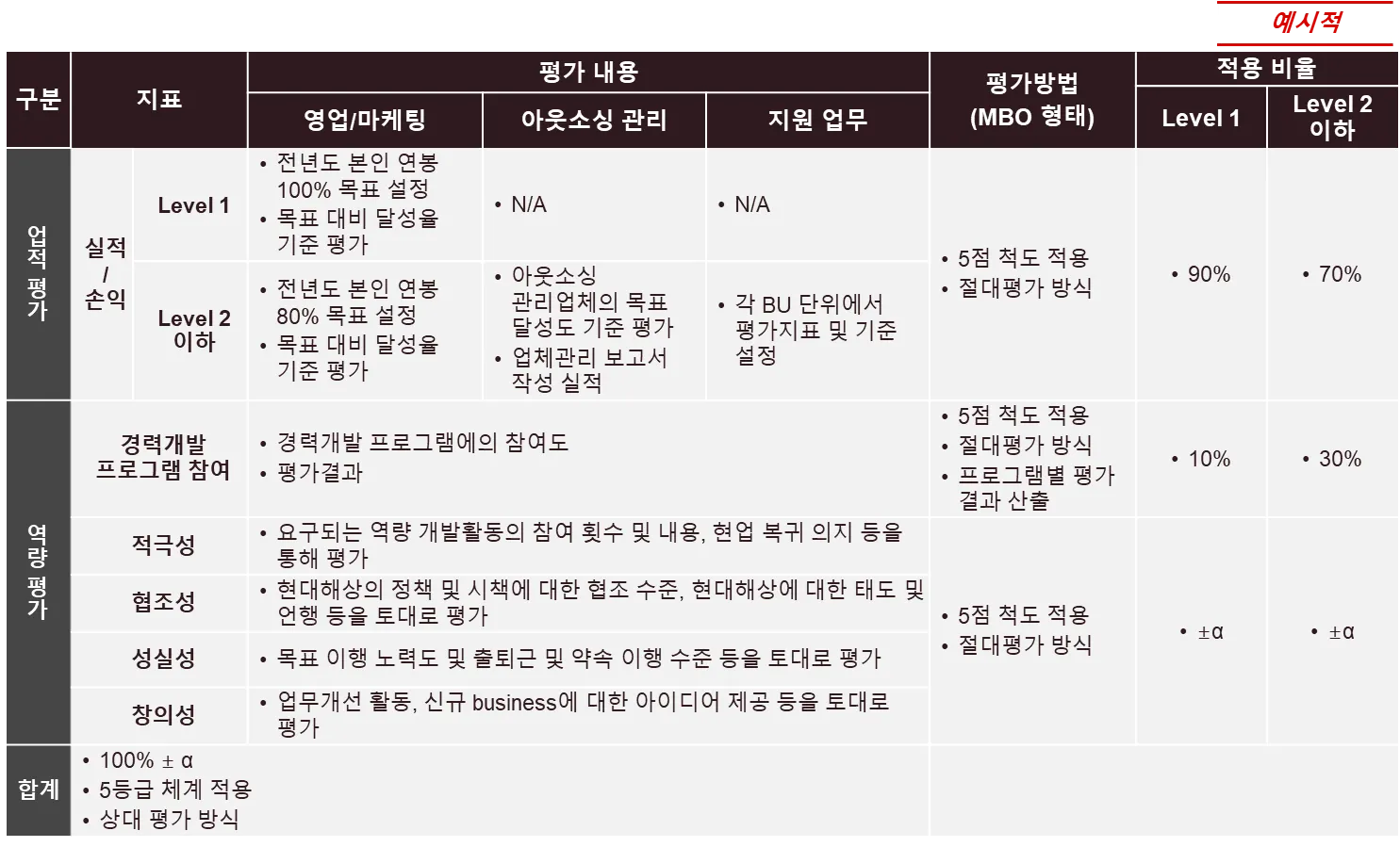 원칙적으로 업무성과 평가를 기준으로 평가하되, 직급에 따라 적용비율을 차별화하여 하위직급에 있어서는 경력개발 프로그램 참여를 통한 육성차원을 강조하는 방향으로 운영합니다.