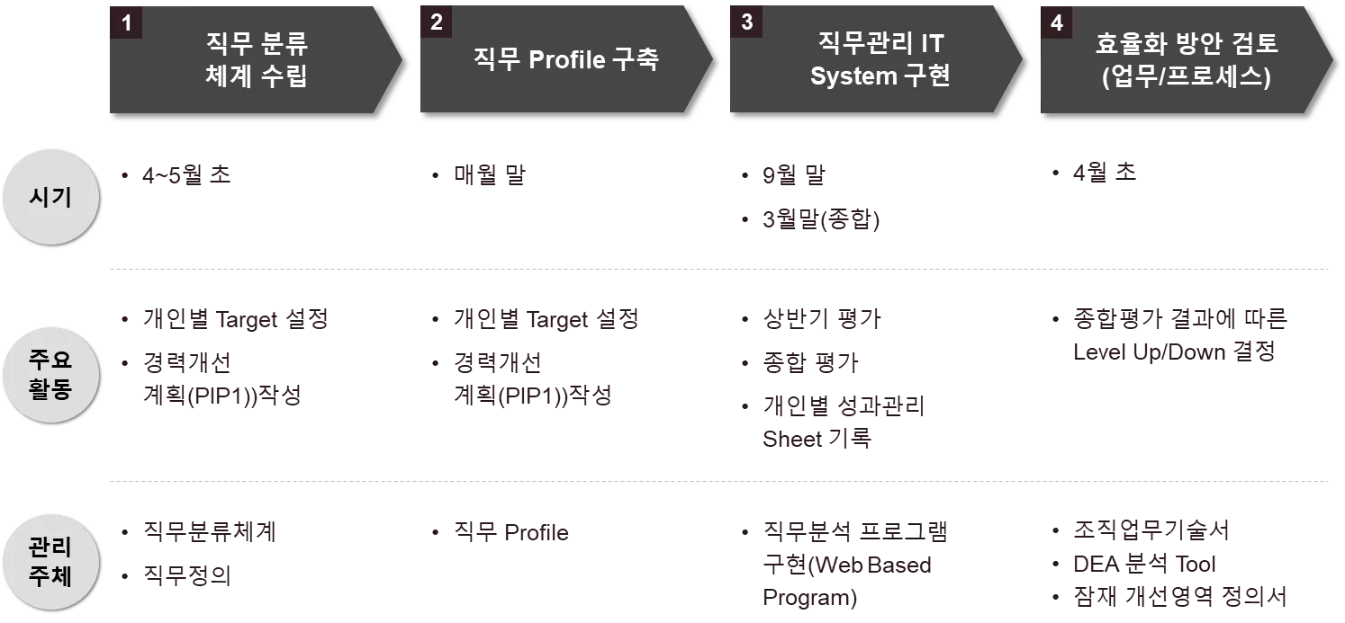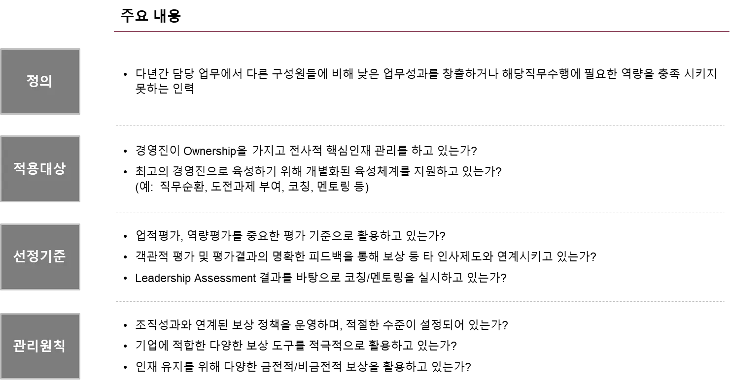 경쟁력 있는 인재 pool을 구성하고 공정한 HR 운영을 위해서는 지속적으로 성과/역량이 부진한 한계인력의 체계적인 관리가 필요합니다.