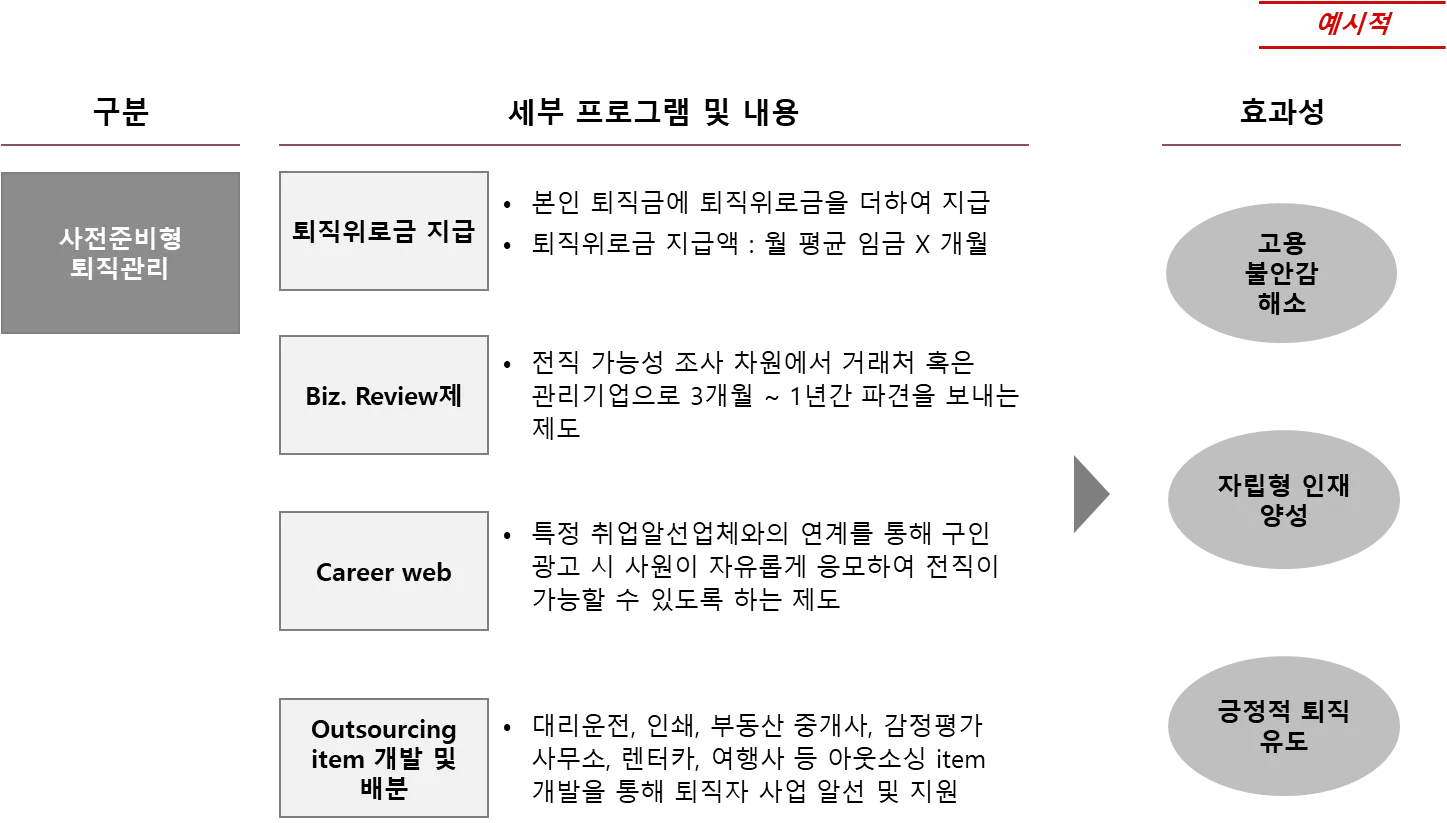 전직지원 사전 준비 형태로 진행되는 방법과 사후적으로 지속적인 관리를 이룰 수 있도록 다양한 프로그램 지원이 필요 합니다.