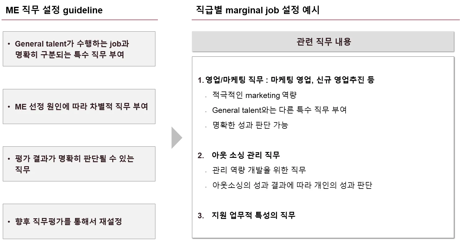 Marginal employee에 대한 관리는 우선적으로 내부화(경력개선 프로그램) 방식에서 출발하여야 하며, 외부화(전직지원 프로그램) 방식은 일정 단계를 거쳐 이행되어야 합니다.