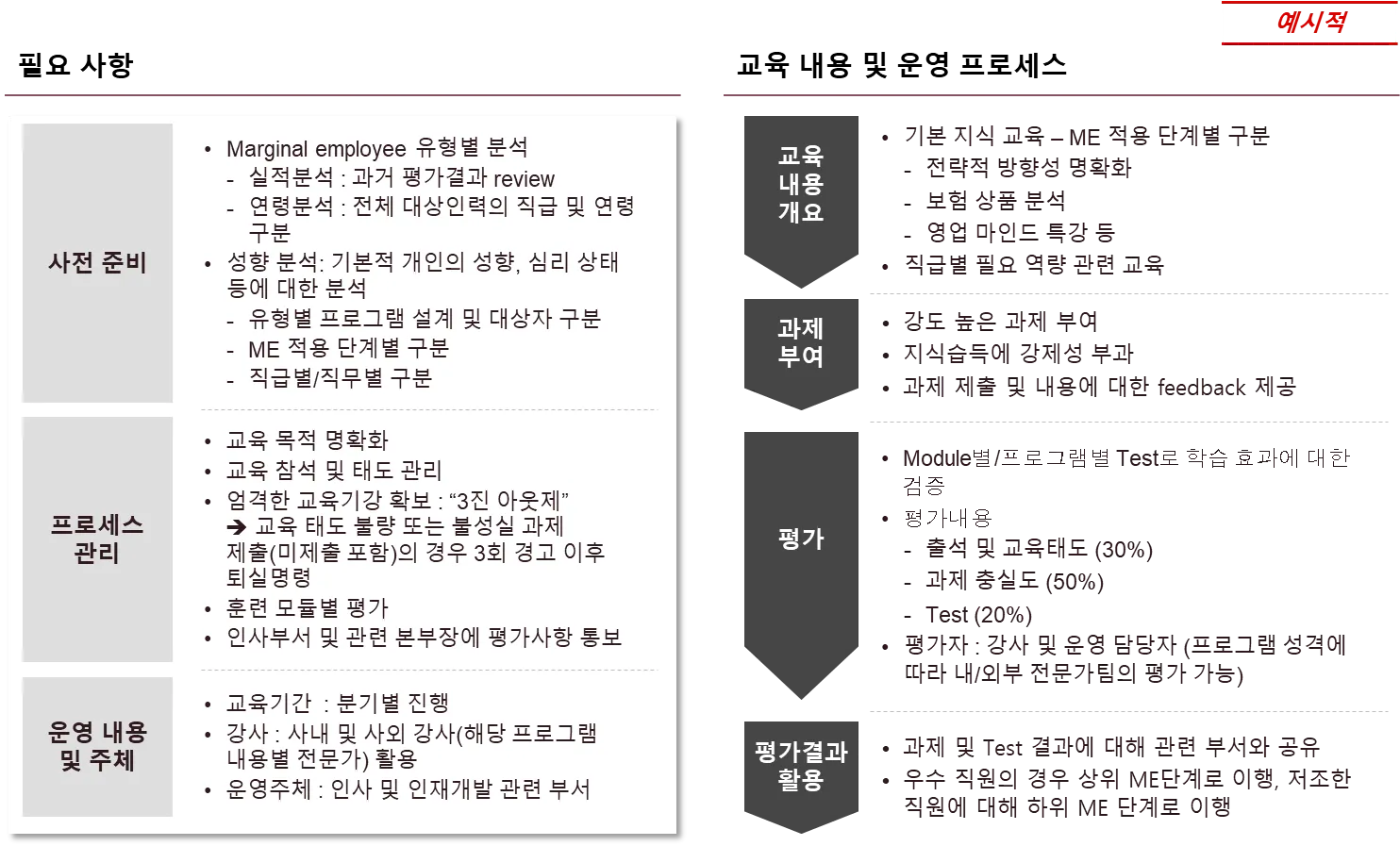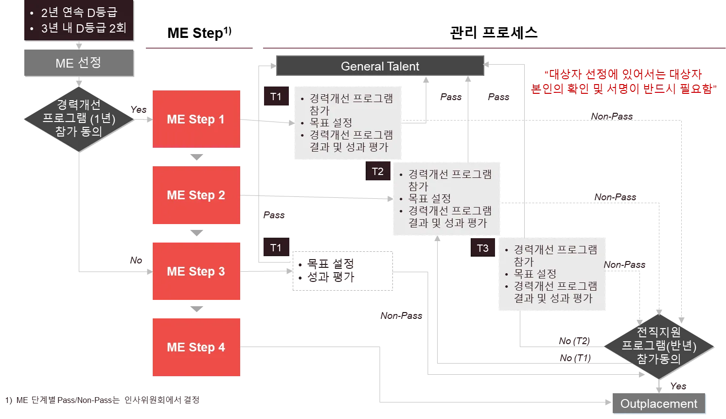 Marginal employee 관리는 경력개선 프로그램 참가여부, 각 단계별 review 결과, 전직지원 프로그램 참가 여부 등의 프로세스를 통해 단계별로 관리될 수 있도록 합니다.
