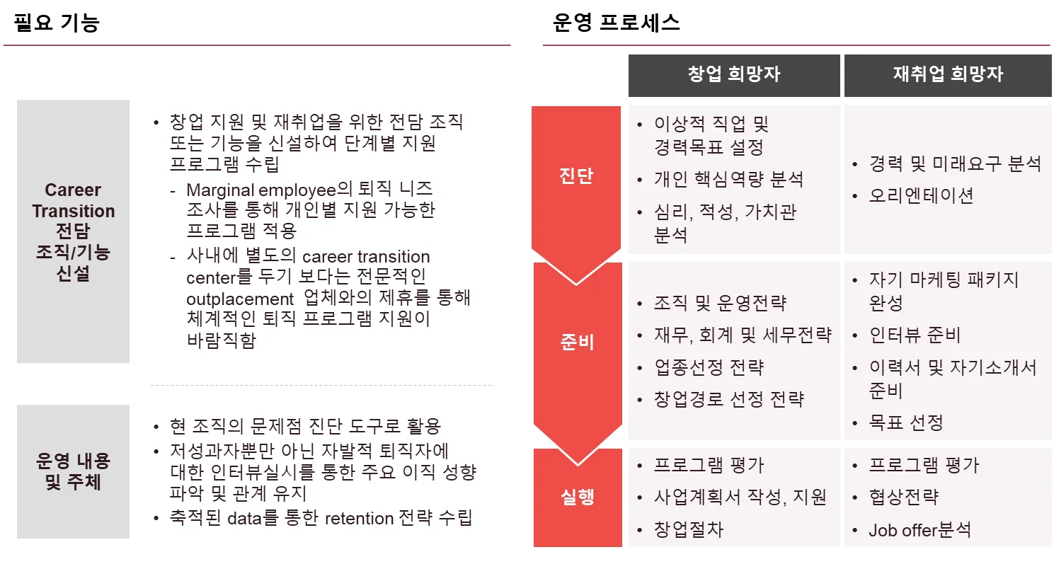 향후 전직지원 프로그램을 전담하는 Career Transition Center의 기능을 운영하여 원활한 전직을 유도할 필요성이 있습니다.