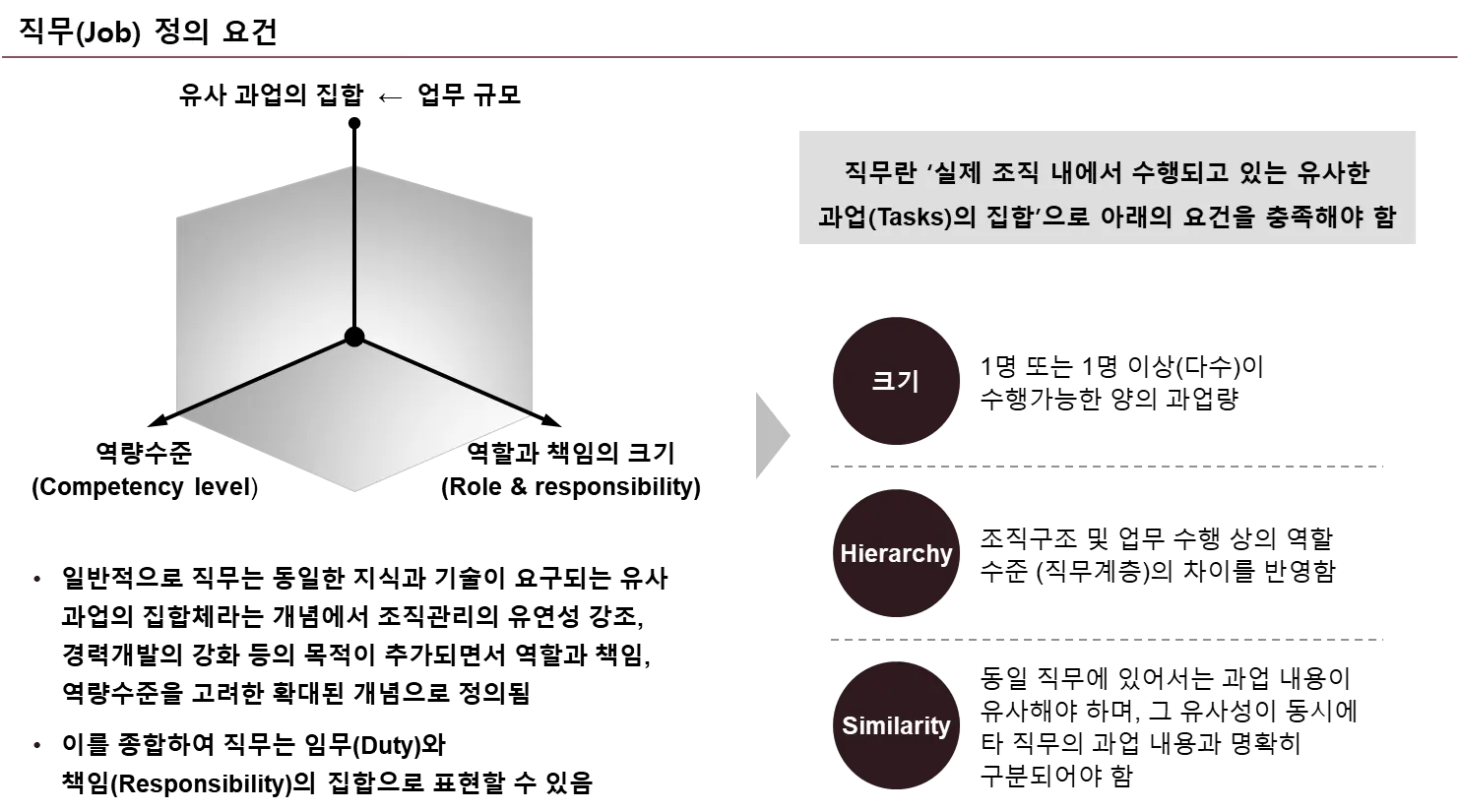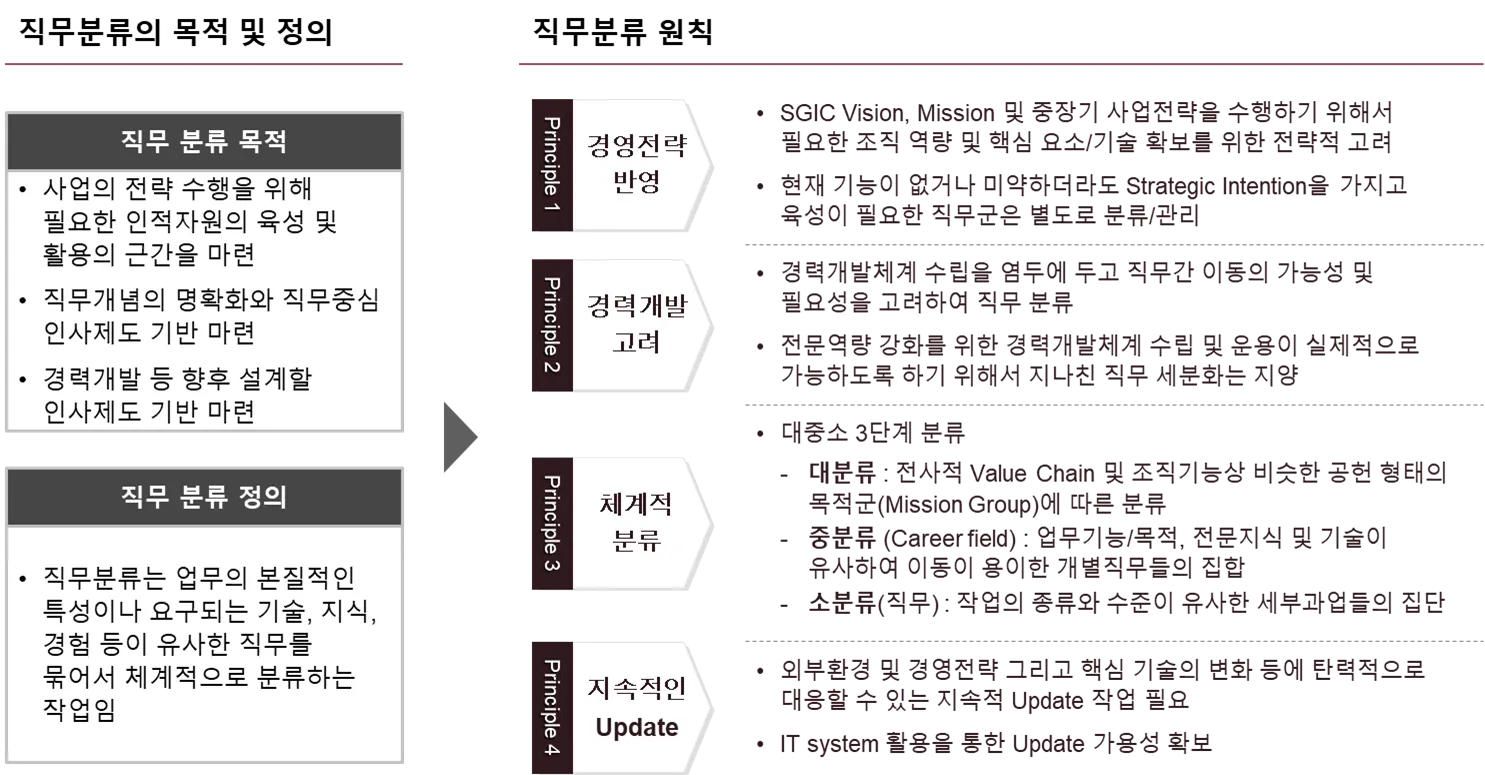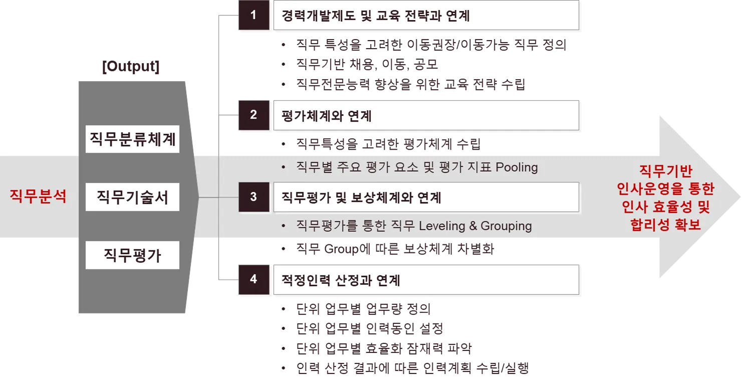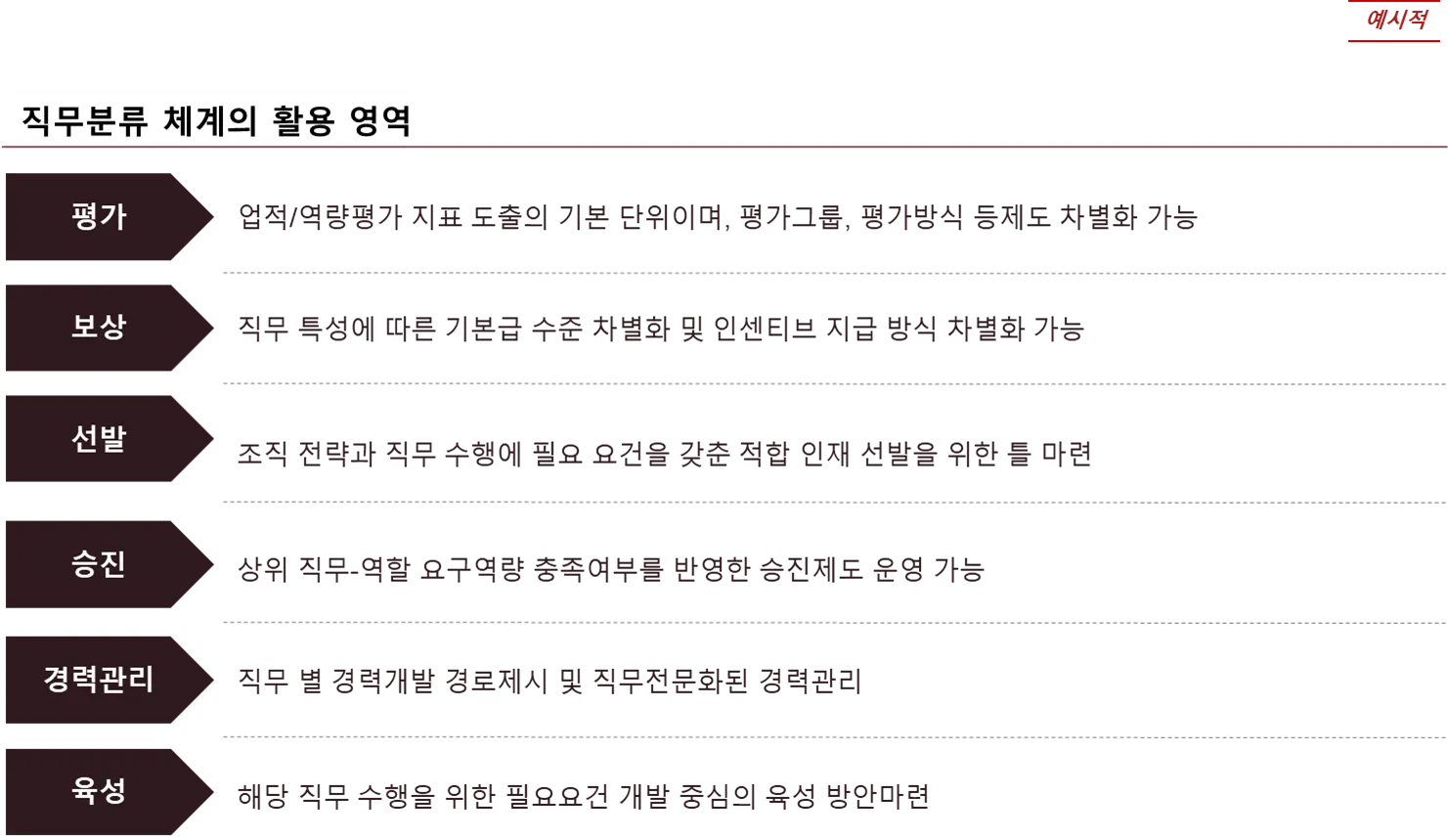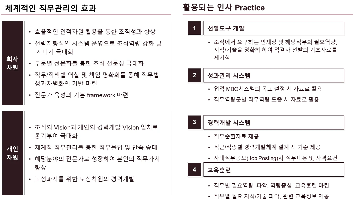 세부적으로는 향후 채용, 평가, 보상 및 경력개발 등 인사제도 전반에 활용되어 직무·성과 중심의 인사관리 실현의 기반이 됩니다.