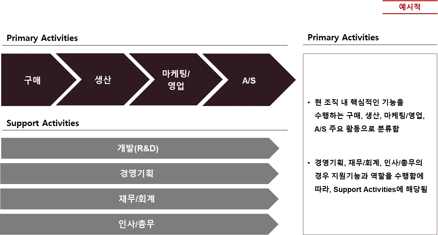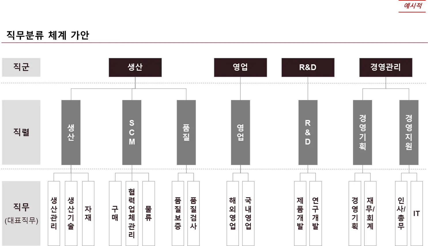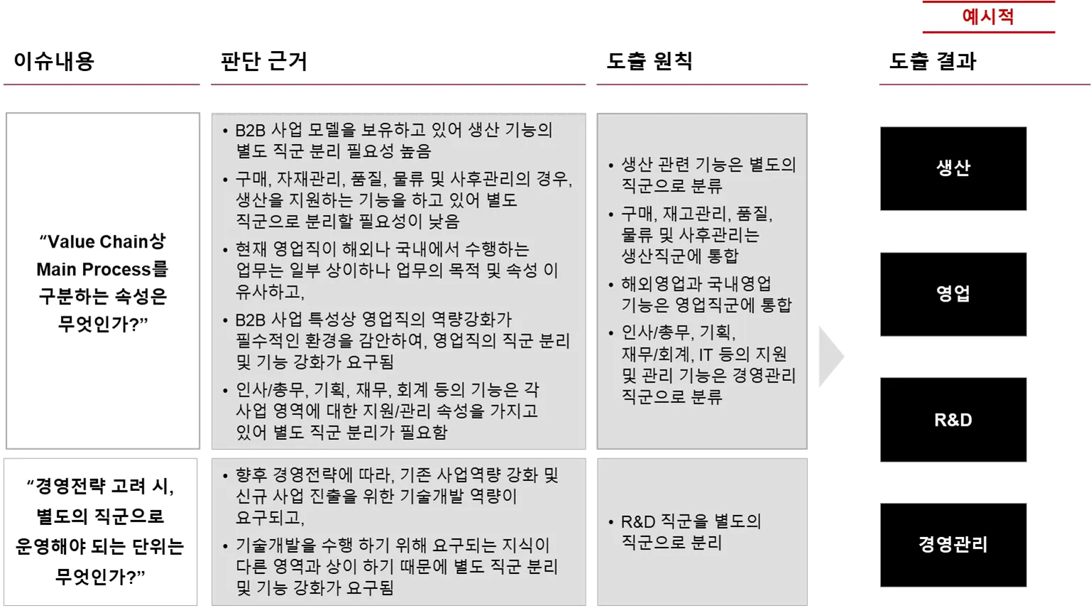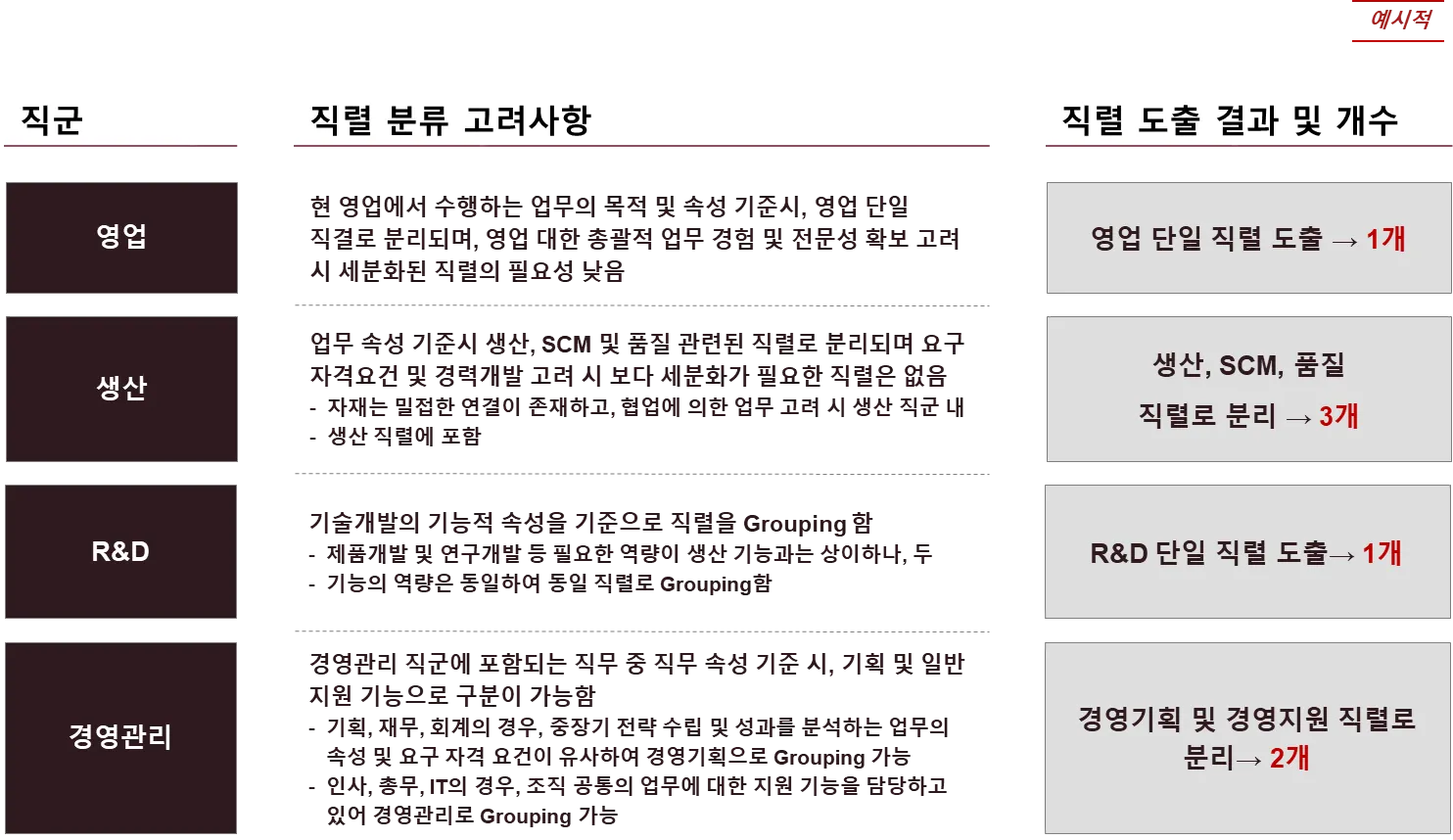 Value Chain 및 조직의 주요 기능을 고려한 직군 도출 원칙을 통하여, 총 4개 직군(생산/영업/R&D/경영관리)이 도출 되었습니다.