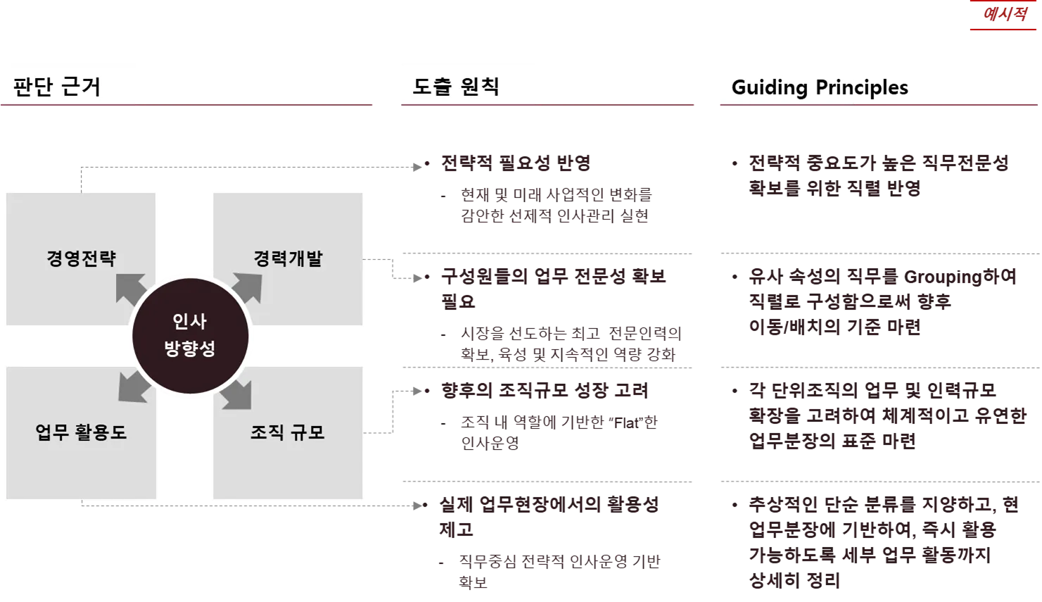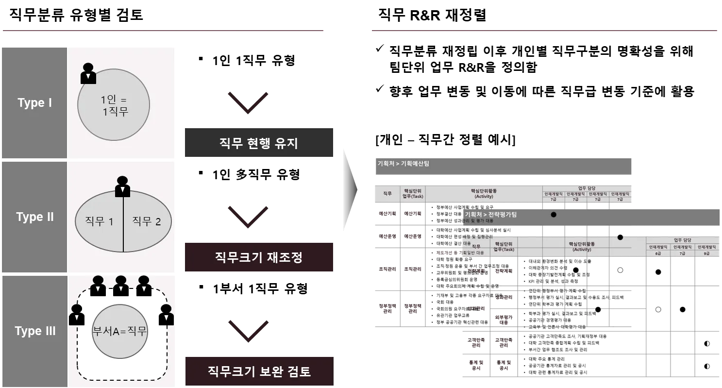現 직무분류에 대한 Case를 구분하고 직무별 특성에 따라 1인 1직무를 원칙으로 직무분류를 검증 및 조정합니다.