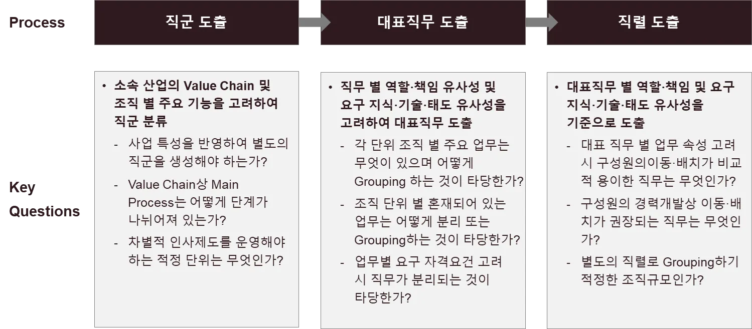 직무의 체계적인 분류를 직군 도출, 대표직무 도출 및 직렬 Grouping의 3단계로 진행하며 각 단계별 Key Question을 토대로 수립합니다.