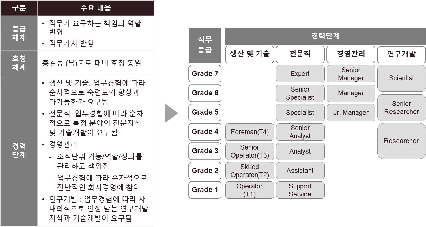 직군별 직위 분리를 통해 업무 효율성과 조직 내 역할 분담을 명확히 하며, 유연한 인력 운용과 조직문화의 다양성을 추구하고 있습니다.