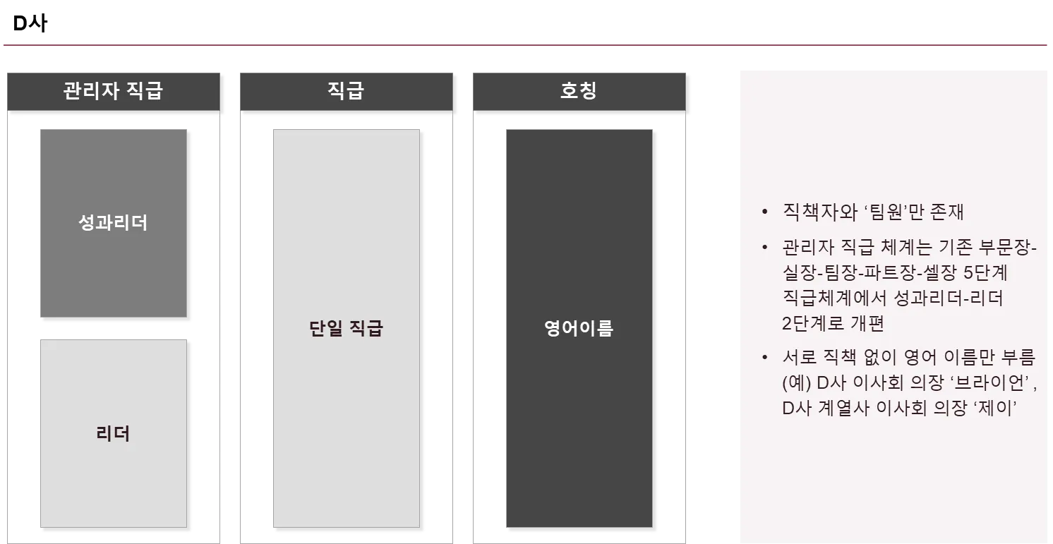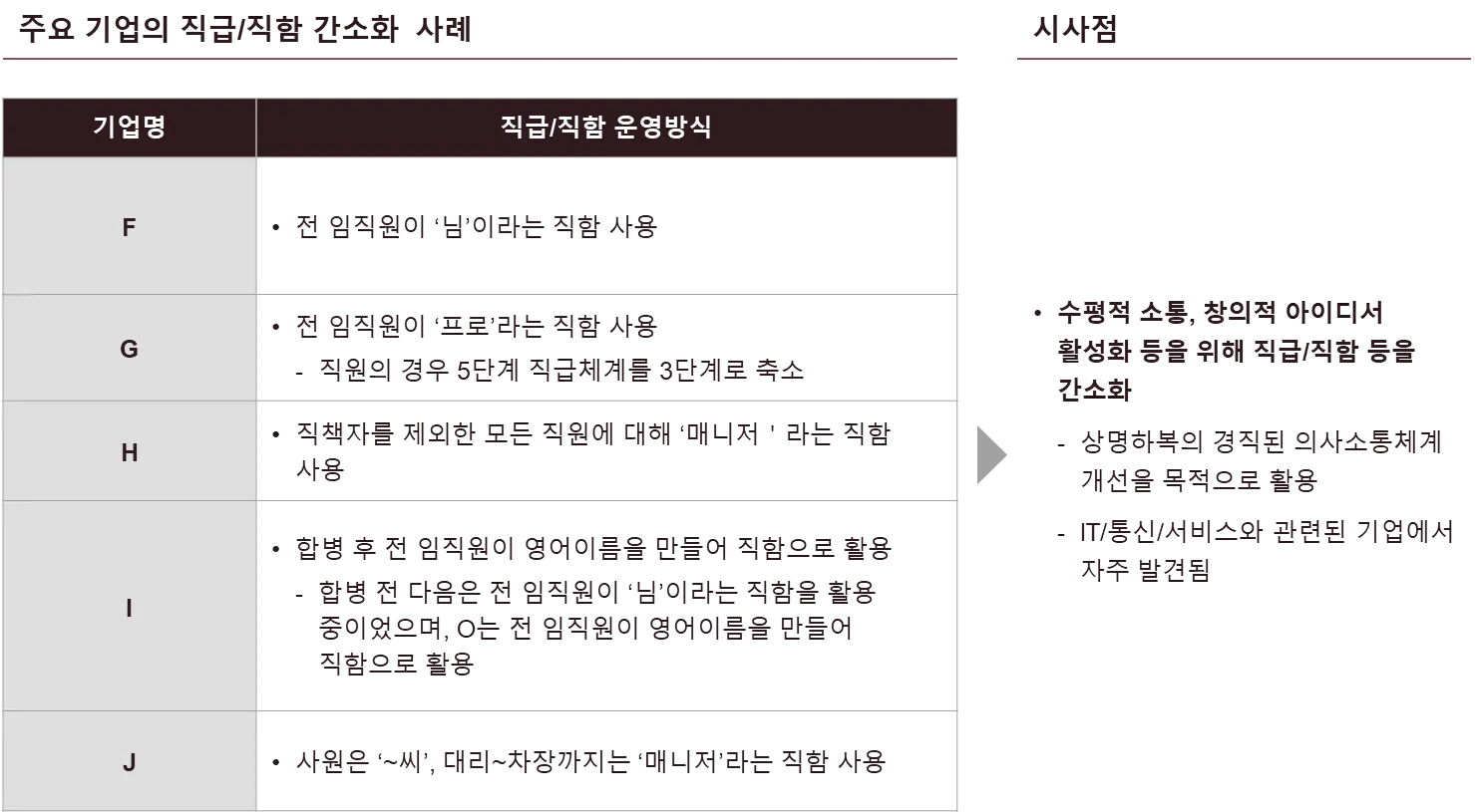 수평적 소통, 창의적 아이디어 활성화를 목적으로 간소화된 직급/직함을 운영하는 기업 사례 입니다.