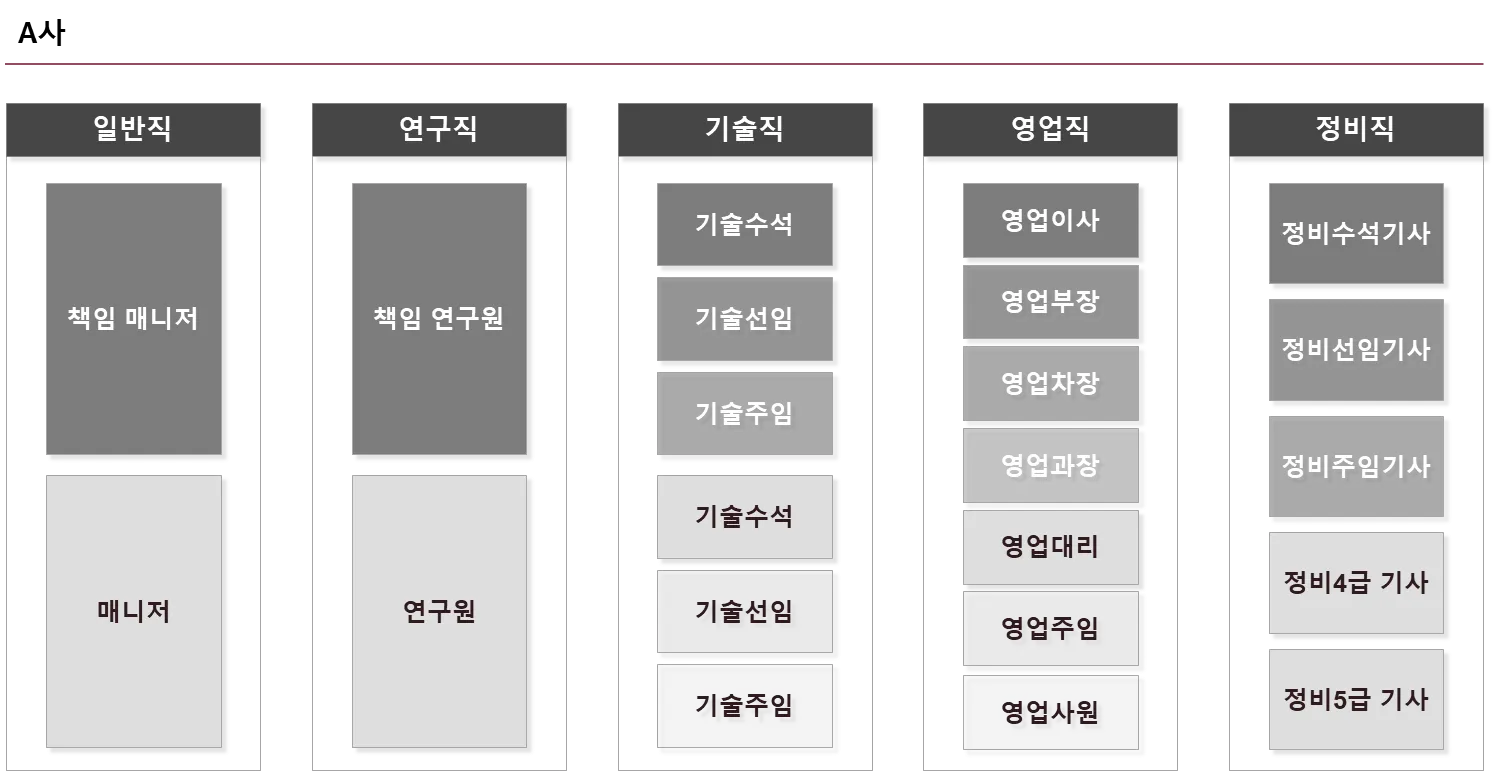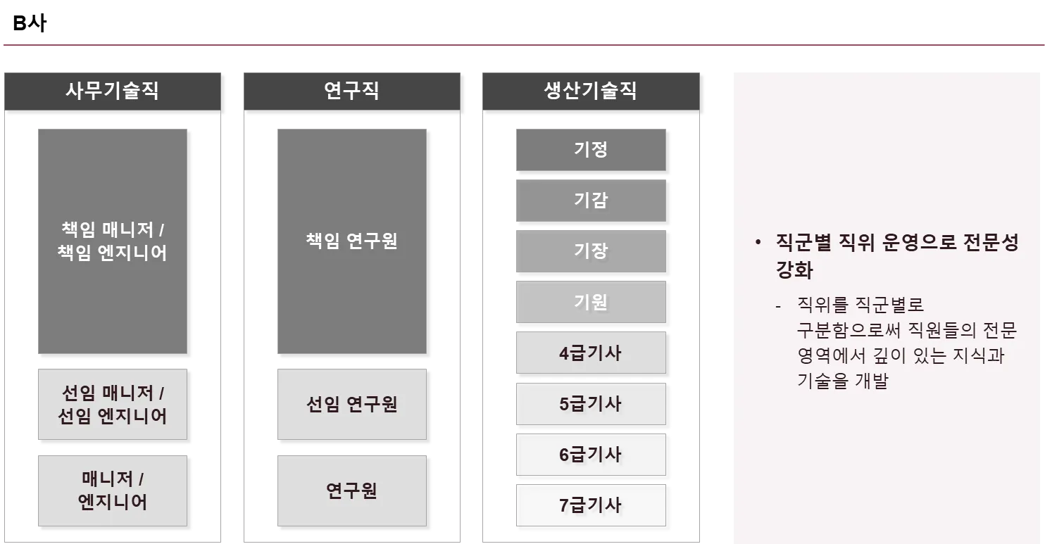 B사도 A사와 마찬가지로 직위를 직군별로 구분함으로써 직원들의 전문 영역에서 깊이 있는 지식과 기술을 개발 하고 있습니다.