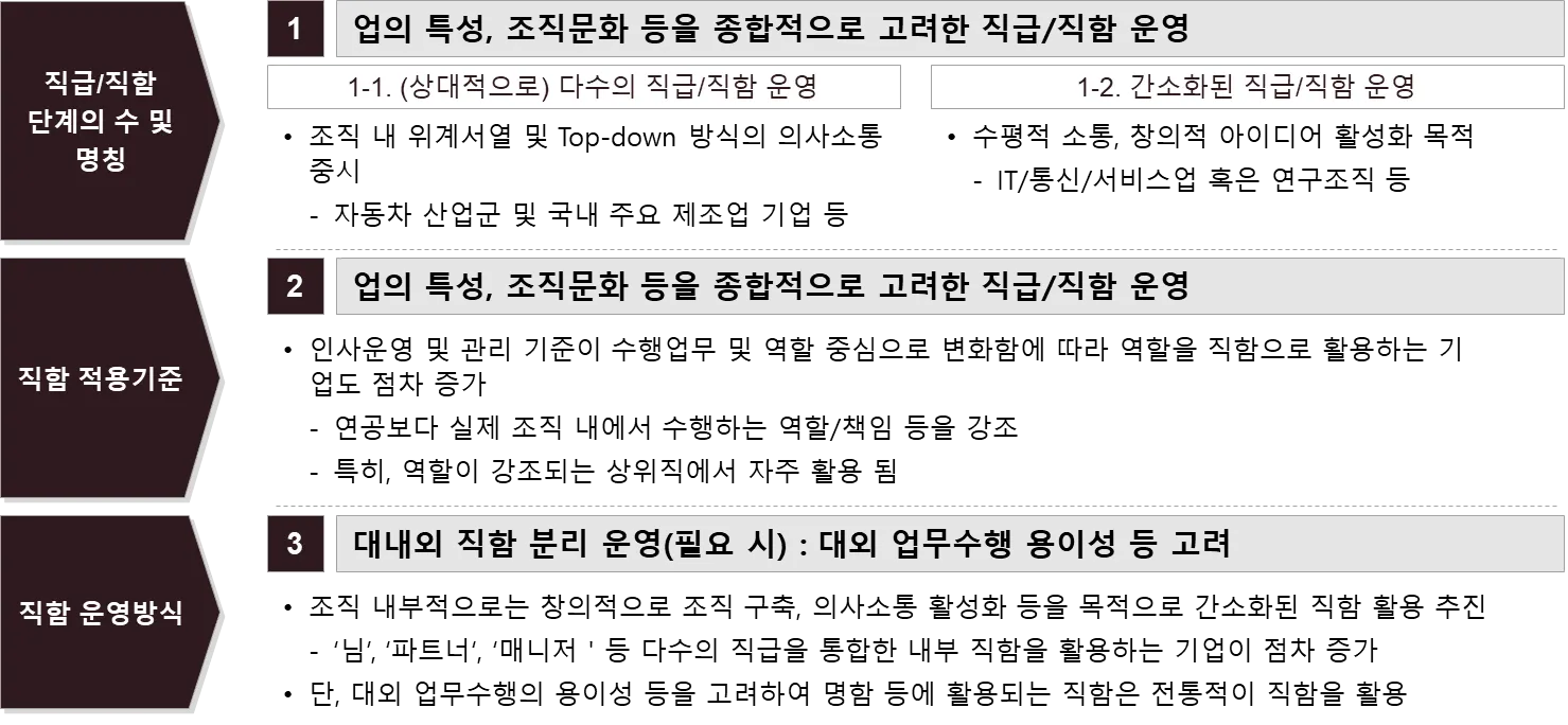 국내 주요기업은 업의 특성, 조직문화를 고려한 직급/직함을 운영 중이며, 직함 적용기준으로 조직내 역할이 강조되고, 기업 별 니즈에 따라 대내외 직함을 분리하여 운영하는 등의 경향이 있습니다.