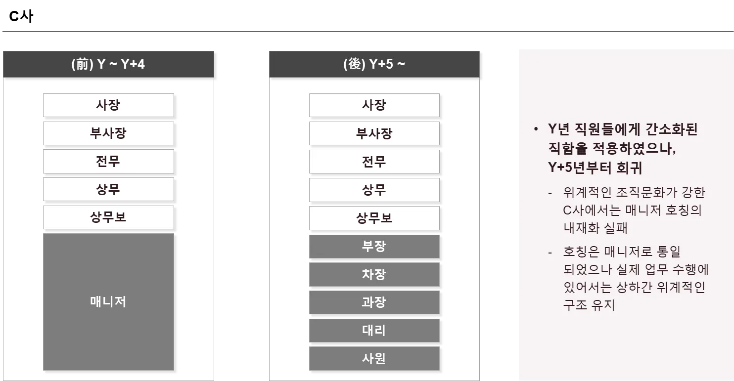 C사는 기존에 간소화된 호칭을 사용하다가, 연공에 대한 조직문화를 바꾸지 못해 내재화에 실패하여 다시 기존의 호칭으로 회귀한 사례입니다.