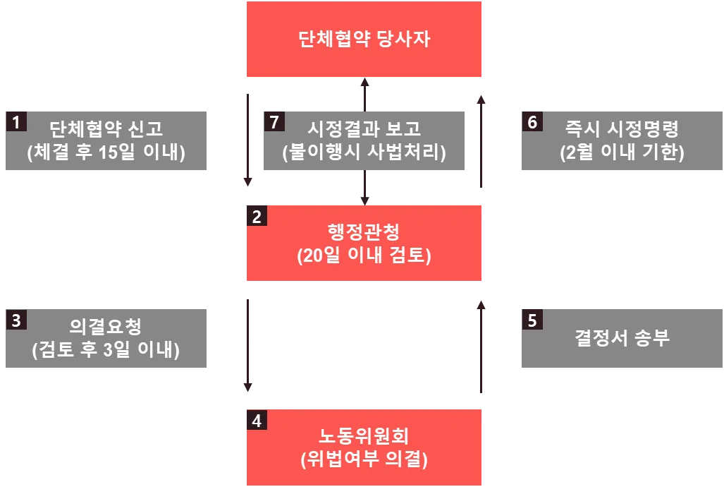 행정관청은 단체협약 중 위법한 내용이 있다고 판단되는 경우 그 위법한 내용을 구체적으로 적시하여 해당 사업장(지부・지회) 관할 노동위원회에 의결 요청