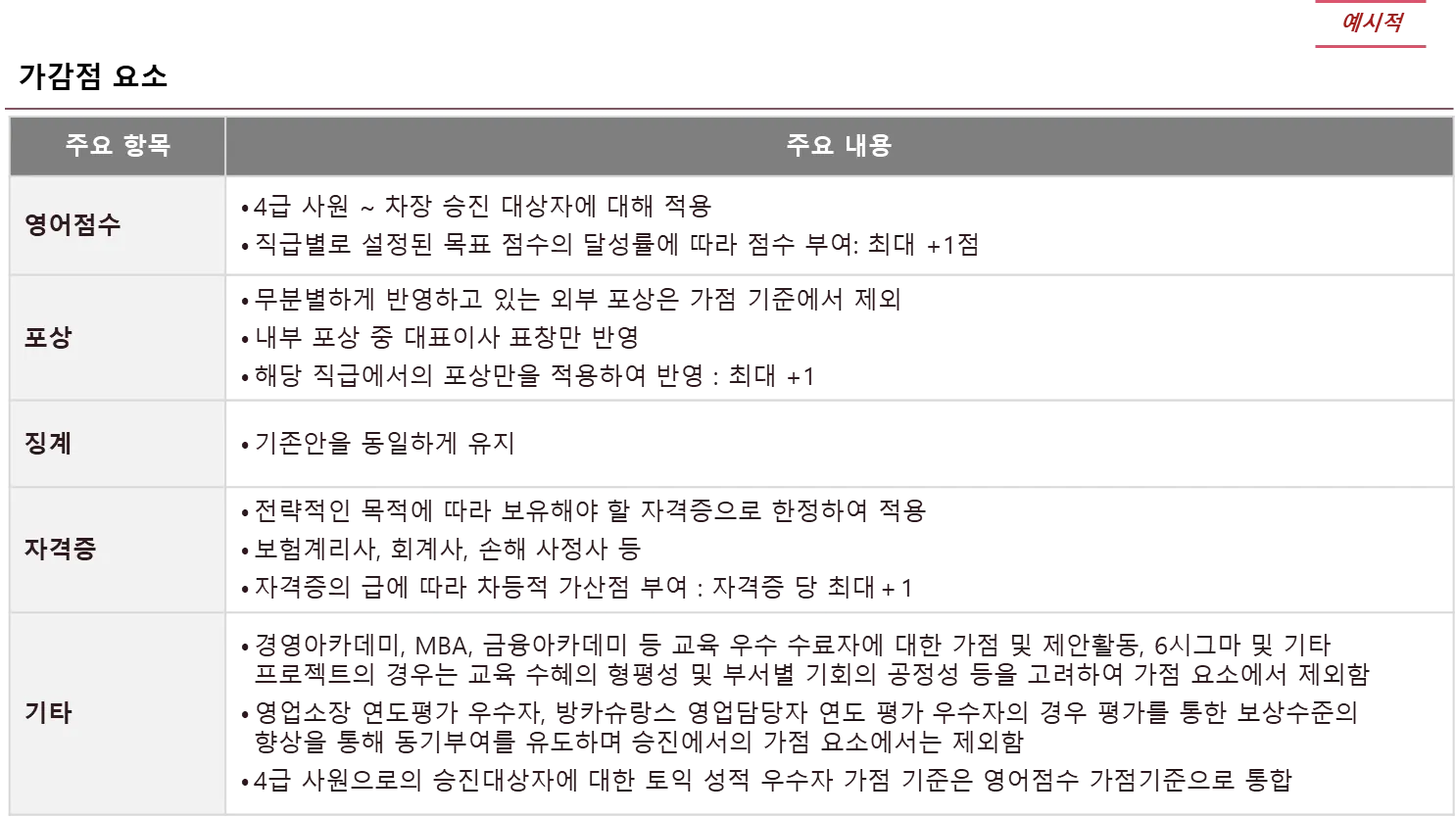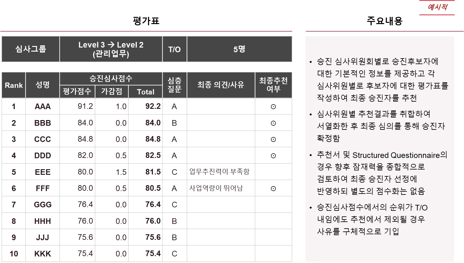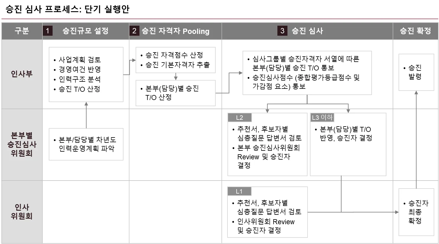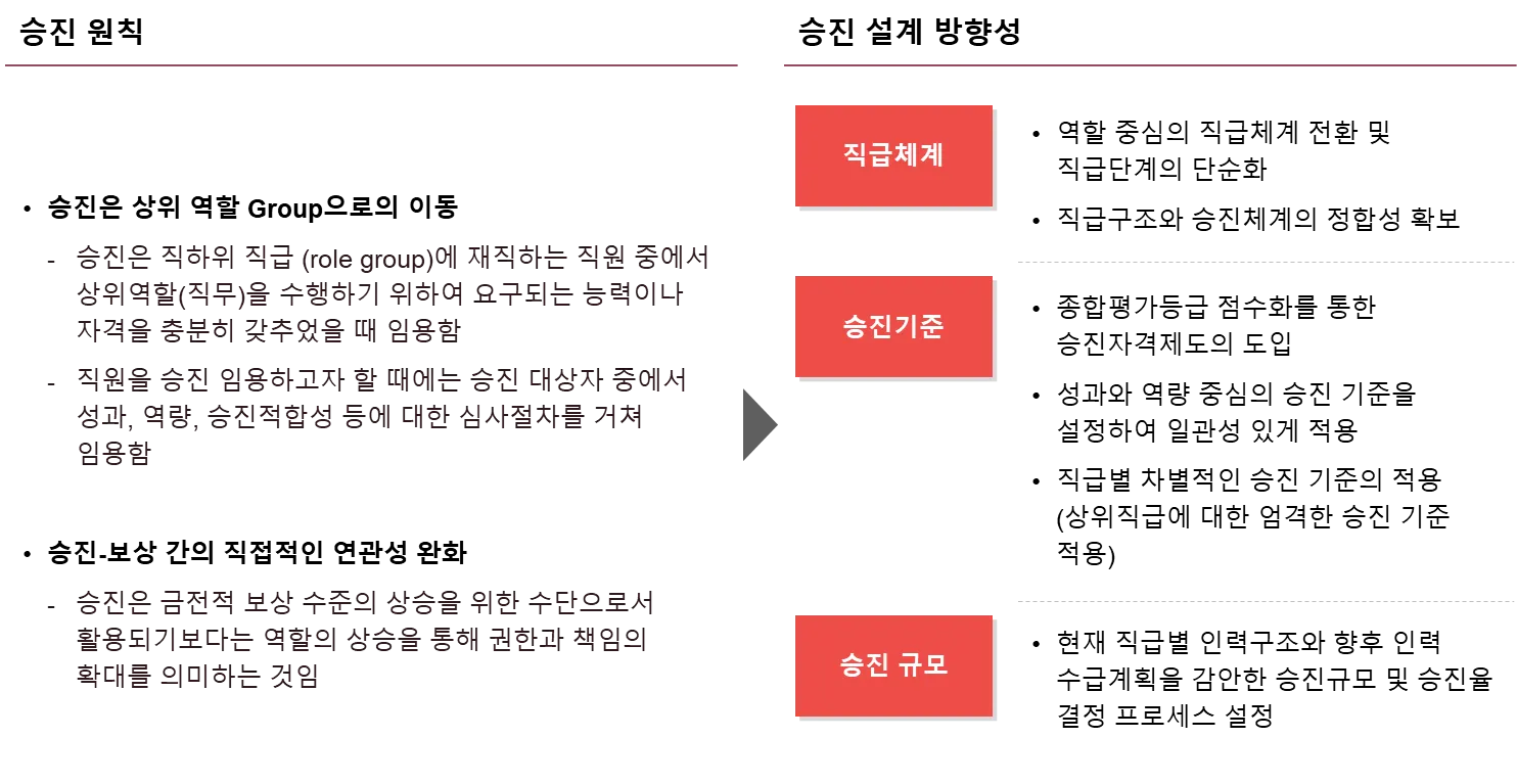승진은 상위 역할 그룹으로의 이동을 의미하며 책임범위의 확대와 역할수준의 상승에 필요한 자질과 능력을 갖춘 직원이 승진할 수 있도록 승진기준과 승진 프로세스를 개선하여야 합니다.