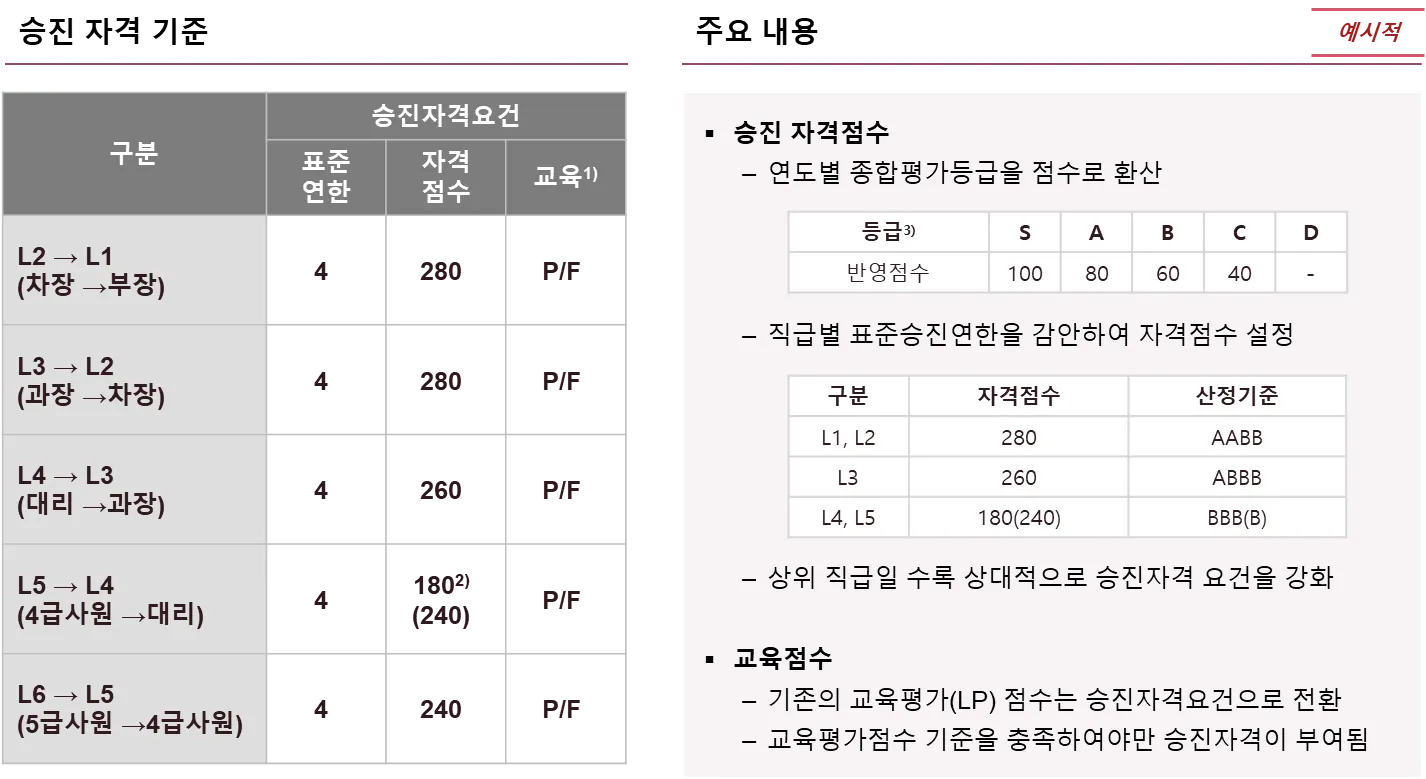 연도별 종합평가등급에 따라 산출된 직급별 승진자격점수를 취득한 후보자를 대상으로 하여 본부(담당)별 승진심사를 통해 승진자를 확정하도록 합니다.