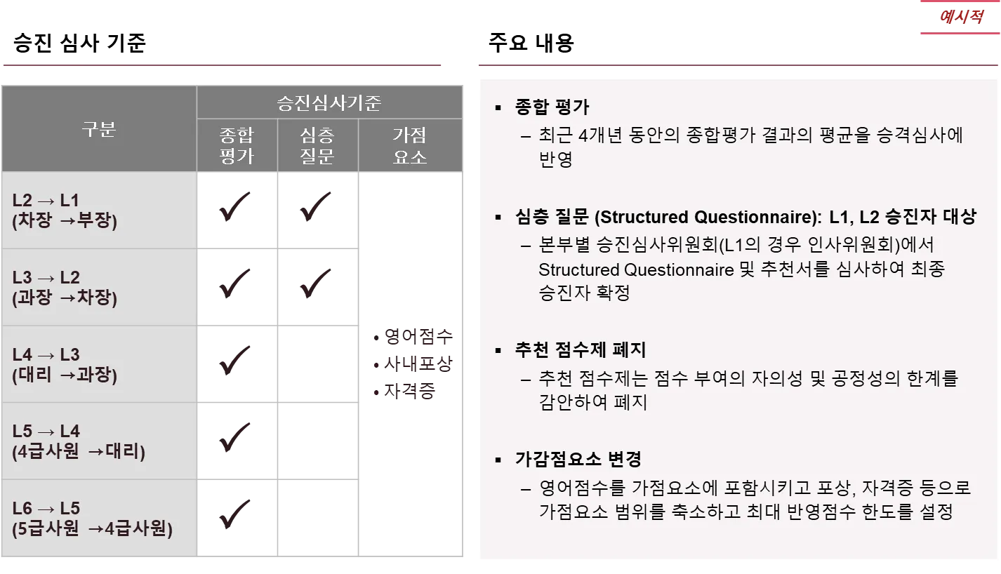 승진자격을 갖춘 후보자들을 대상으로 종합평가를 반영하여 승진 심사를 하되, Level 2 이상 직급으로의 승진은 담당 부서장의 추천서 및 승진후보자의 Structured Questionnaire 답변서에 대한 검토를 통해 승진자를 확정 합니다.