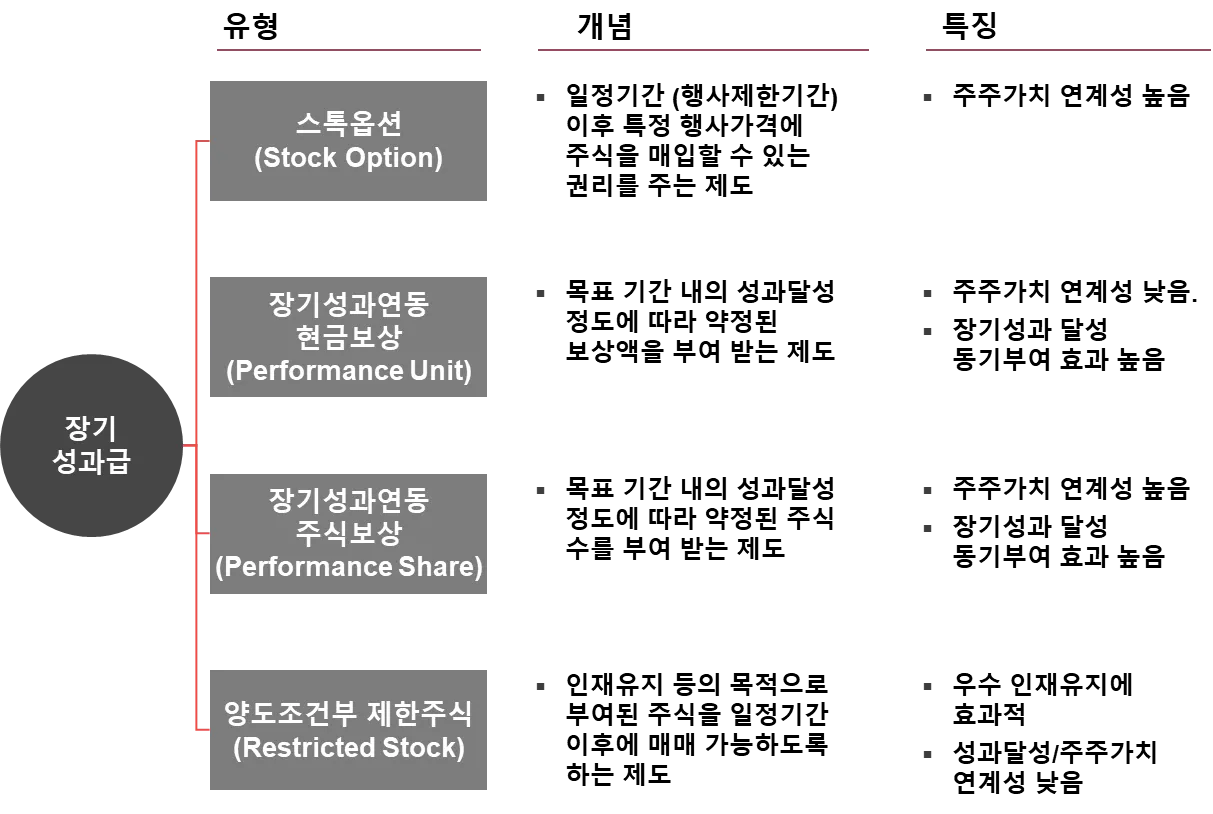 장기성과급의 활용 목적은 장기성과 drive, 핵심임원 retention, 주주가치 제고 등이 있으나,