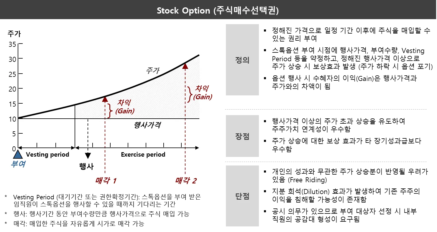 Stock Option(주식매수선택권)은 행사가격 이상으로 주가가 상승했을 경우 행사 당일 주가와 행사가격과의 차액만큼을 보상 받게 되는 주식기반의 장기성과급