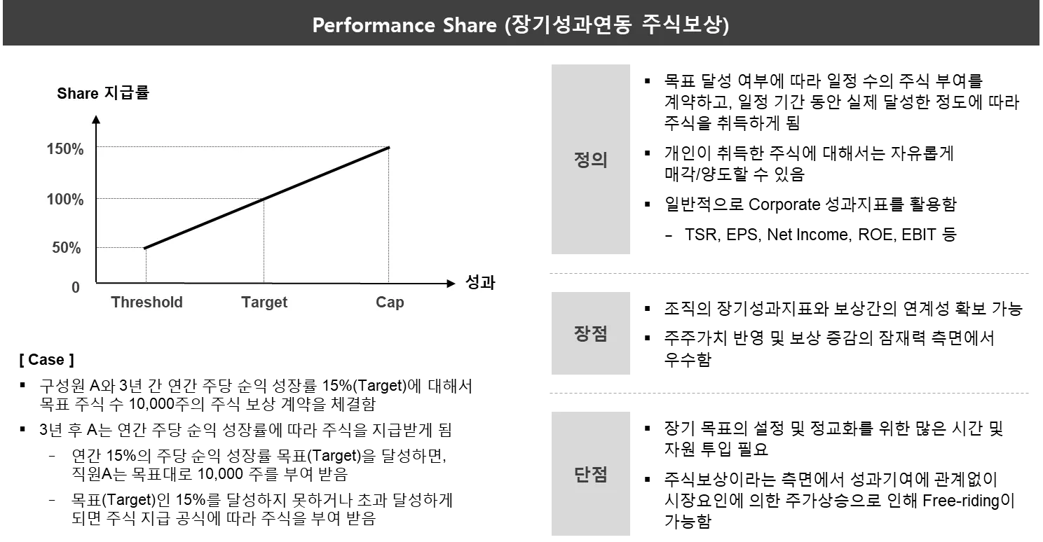 Performance Share(장기성과연동 주식보상)은 평가기간 동안의 성과달성 정도에 따라 일정 수의 주식을 지급하는 제도