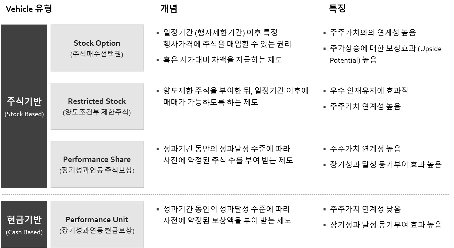 과거 스톡옵션을 많이 활용하였으나, 최근 장기성과에 연동한 현금 또는 주식보상 방식을 도입하는 기업이 늘어나고 있음