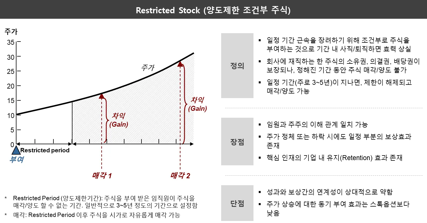 Restricted Stock(양도제한 조건부 주식)은 Full value를 제공하여 Retention & Ownership을 향상시키고, 주가 정체 또는 하락 시에도 보상 효과가 존재