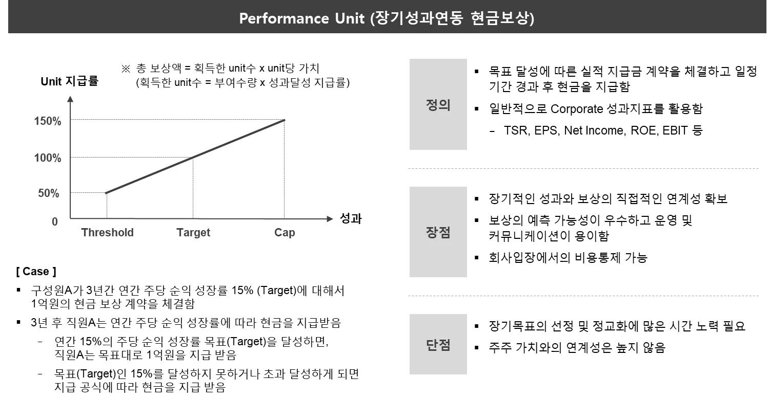 Performance Unit(장기성과연동 현금보상)은 평가기간 동안의 성과달성 정도에 따라 현금을 지급하는 제도