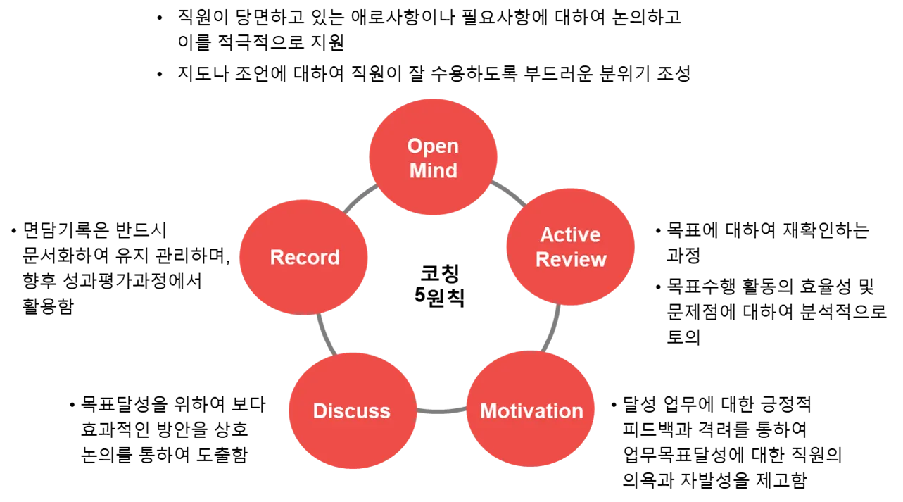 기본적으로 코칭은 수시로 시행되며, 평가자와 피평가자 사이의 일상적인 의사소통으로, 평가자와 피평가자는 각자가 수시로 업적 및 역량 목표 수행 정도에 대해 성과를 기록합니다.