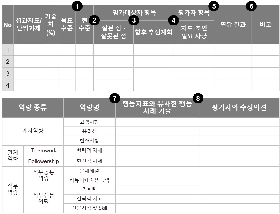 ⑦ 행동지표와 유사한 행동 사례 기술 : 역량 별 행동지표에 의거하여 피평가자의 유사한 행동 사례를 기술