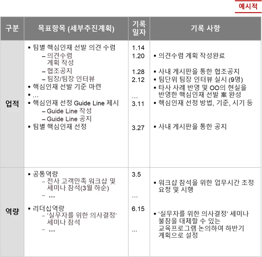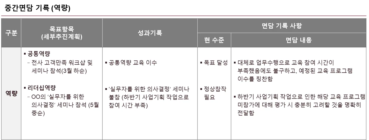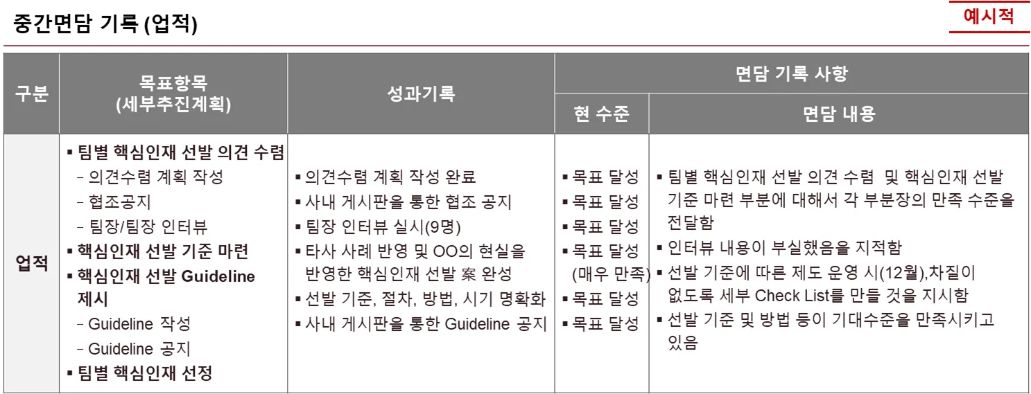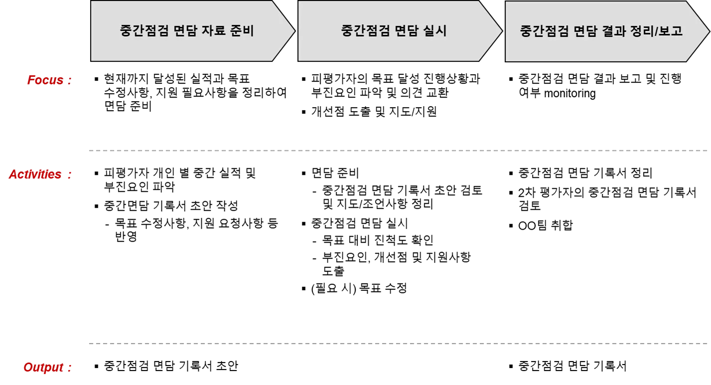 중간 점검 단계에서는 설정한 업적 목표 별 추진현황에 대해 평가시점까지 목표달성이 가능하도록 개선점을 도출하고 지도하도록 합니다.