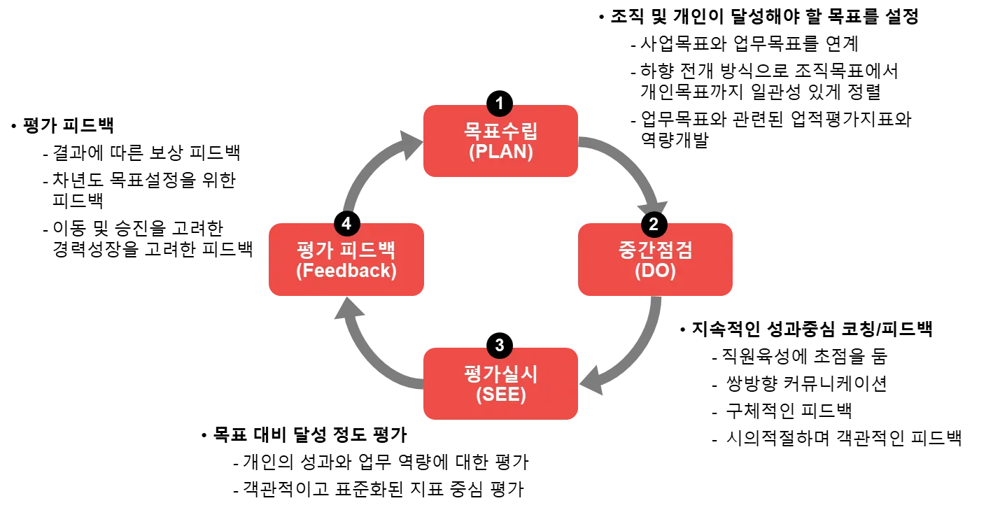 개인평가 프로세스는 목표설정, 중간점검, 평가 실시, 피드백의 4단계로 이루어지며, 평가자와 피평가자 간의 커뮤니케이션을 통해 이루어지는 지속적인 프로세스입니다.