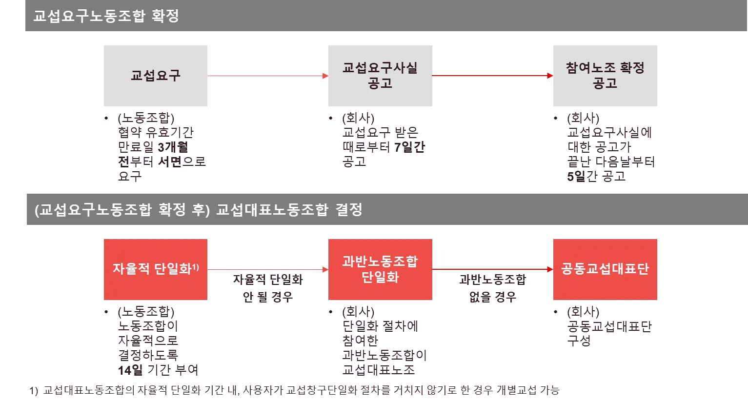 교섭창구단일화 절차는 ‘교섭요구노동조합 확정 절차’ 및 ‘교섭대표노동조합 결정 절차’로 구성