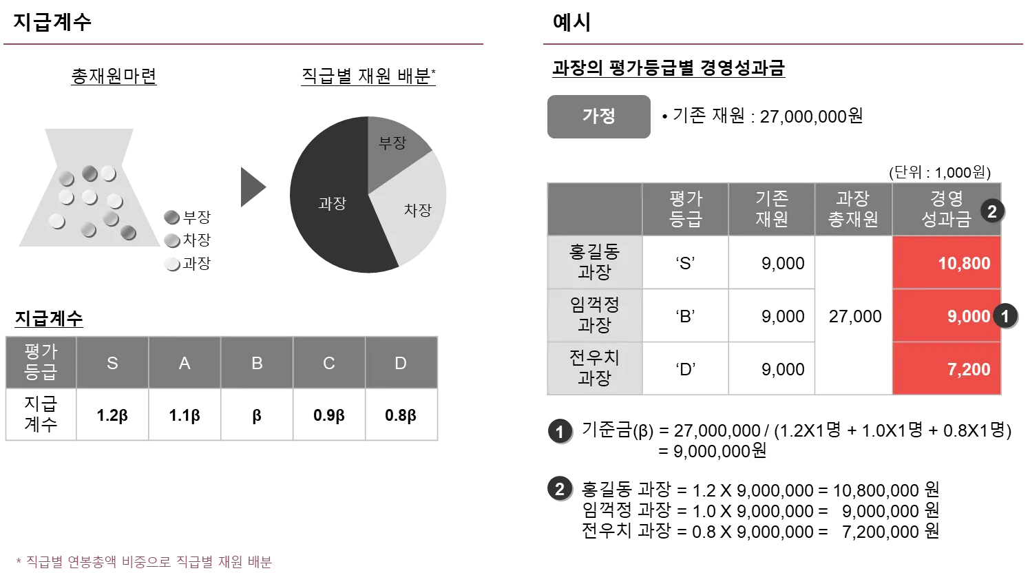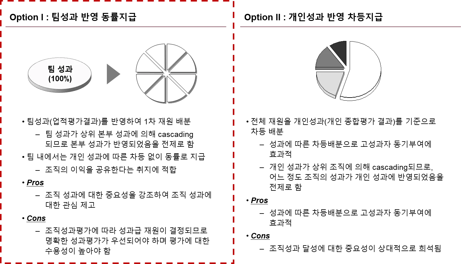 (Option 2) 개인 성과에 따라 경영성과급을 지급할 경우 팀장/팀원의 성과계수를 차등화함으로써 팀장의 성과에 대한 책임을 보다 강조할 수 있습니다.