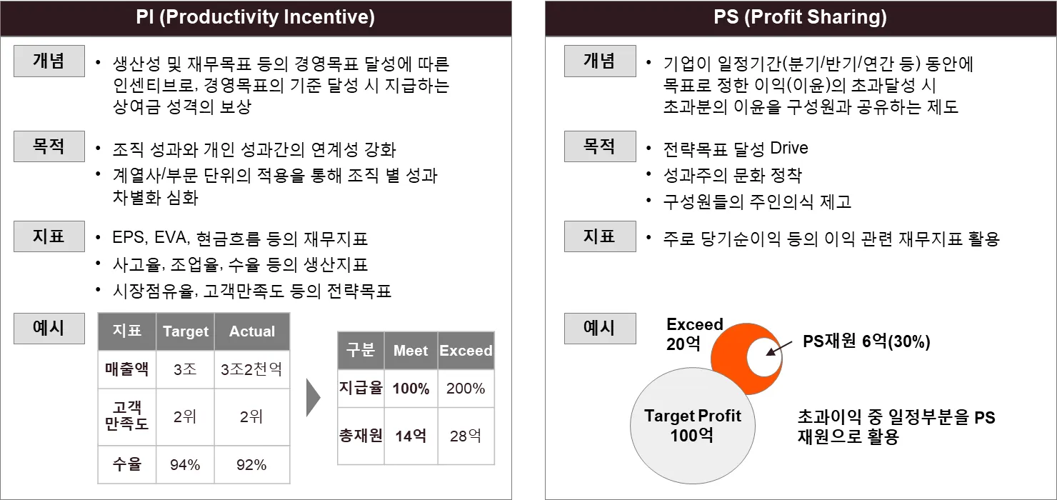 경영성과급에는 PI(Productivity Incentive)와 PS(Profit Sharing)이 있습니다.