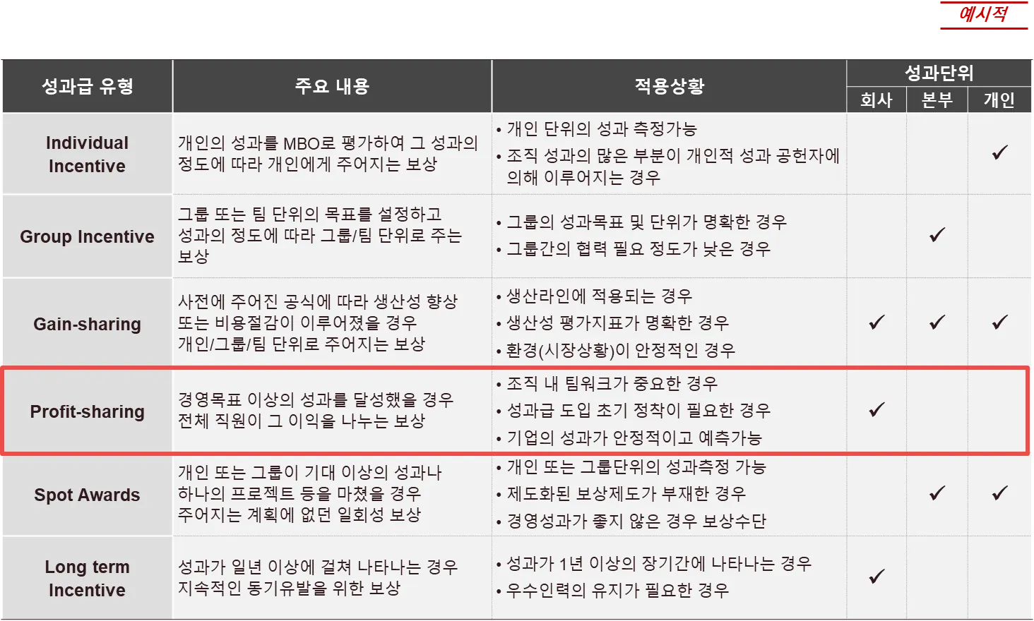 성과급 제도는 다수의 유형이 존재하며 직무 및 동종업계 Market practice 등을 고려한 성과급 제도를 선택·적용해야만 성공적인 제도 운영이 가능합니다.