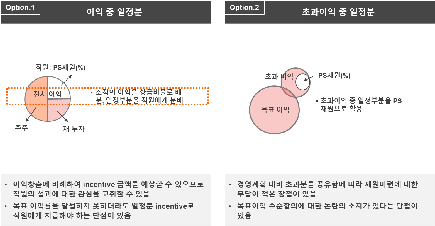 Incentive 지급수준의 예측가능성과 조직성과에 대한 관심을 증가시키고 ‘조직이익에 대한 일정분을 직원에게 환원시킨다’는 조직과 직원의 일체감 강화를 위해 영업이익의 일정분을 PS 재원으로 설정합니다.