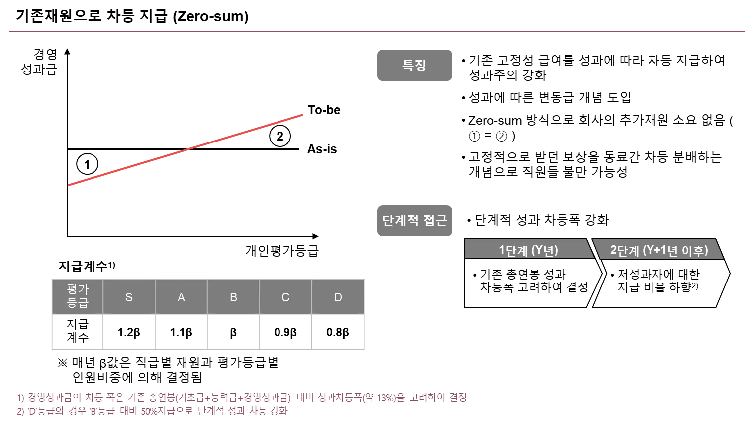 기존 고정성 경영성과금 재원으로 직원 성과에 따라 차등지급하며, 성과주의를 강화하기 위해 단계적으로 차등폭을 확대 합니다.