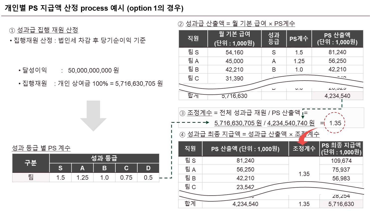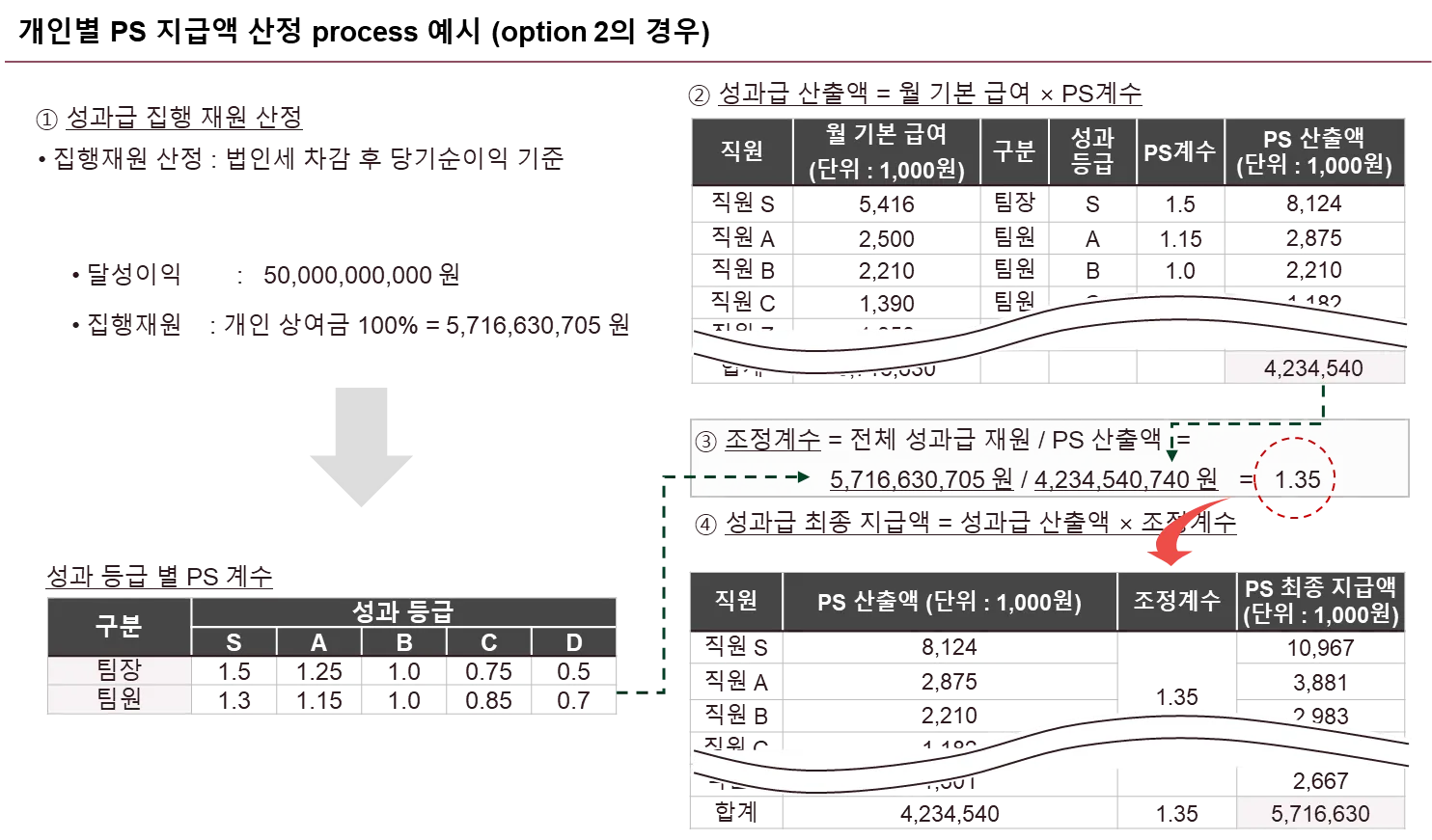 (Option 1) 개인 별 경영성과급 지급액을 산정하는 프로세스는 다음과 같이 이루어지며, 성과 등급에 따른 PS 계수에 대한 경영진의 의사결정이 필요합니다.