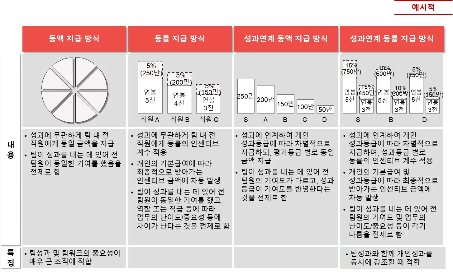 팀원에 대한 인센티브 지급은 다음과 같은 네 가지 방식으로 구분되며, 조직의 상황에 따라 팀장의 재량에 맡기는 것을 원칙으로 합니다.