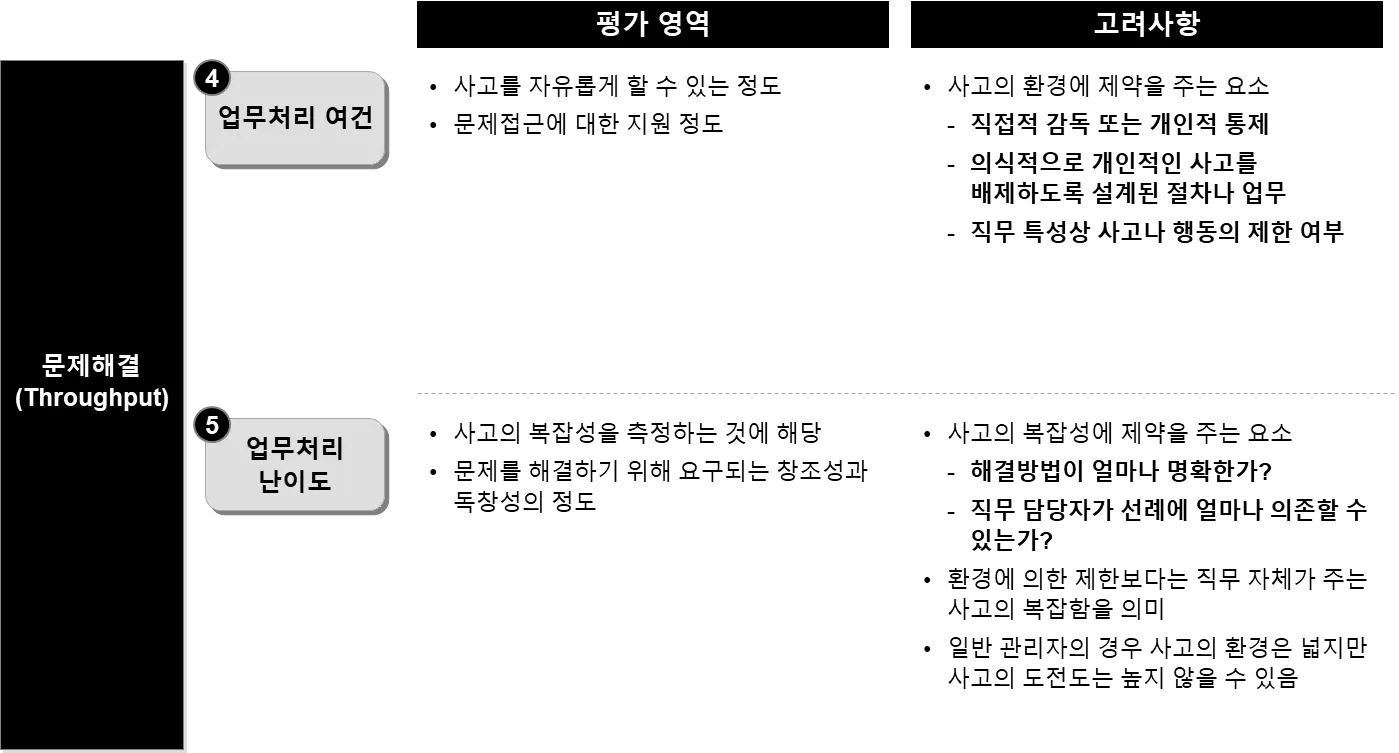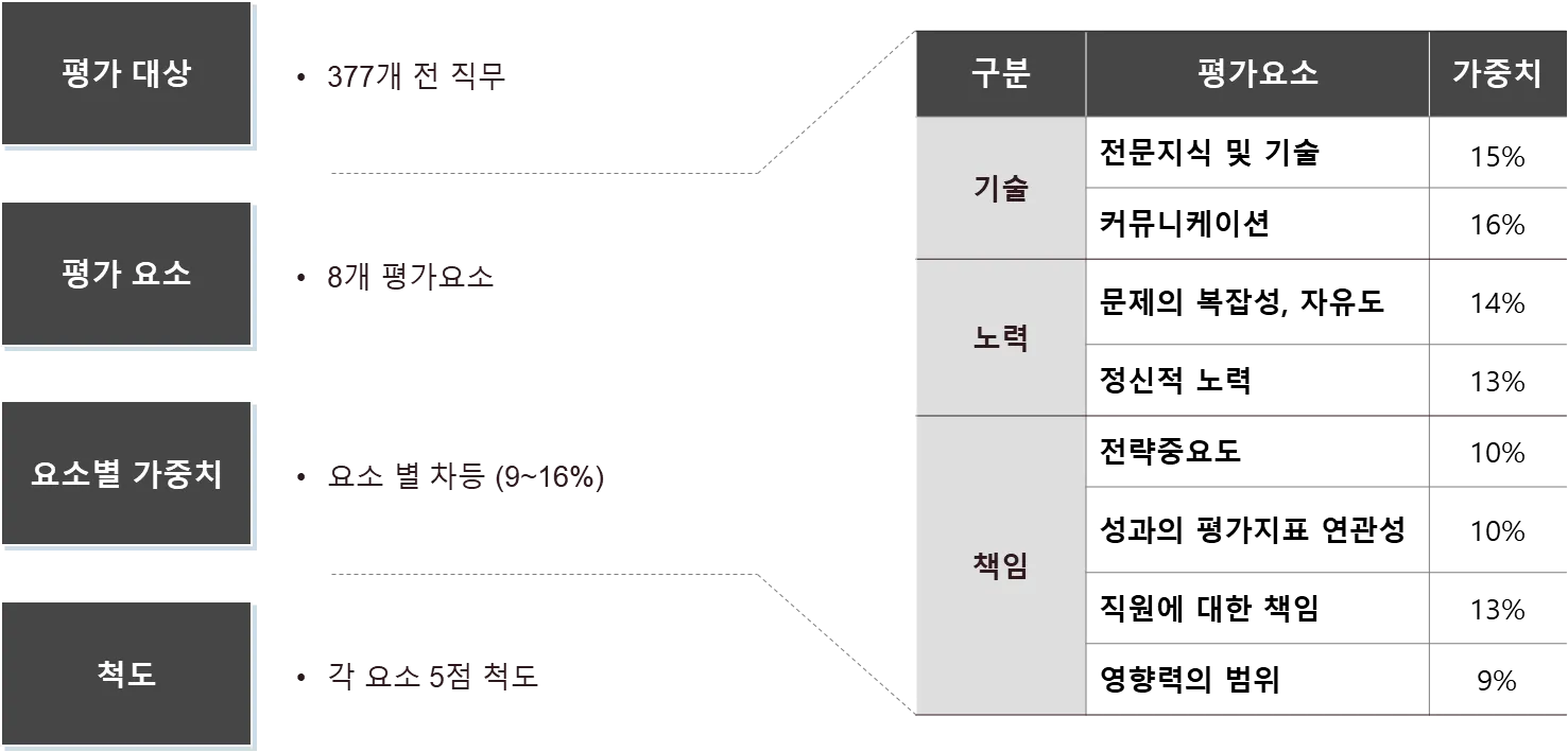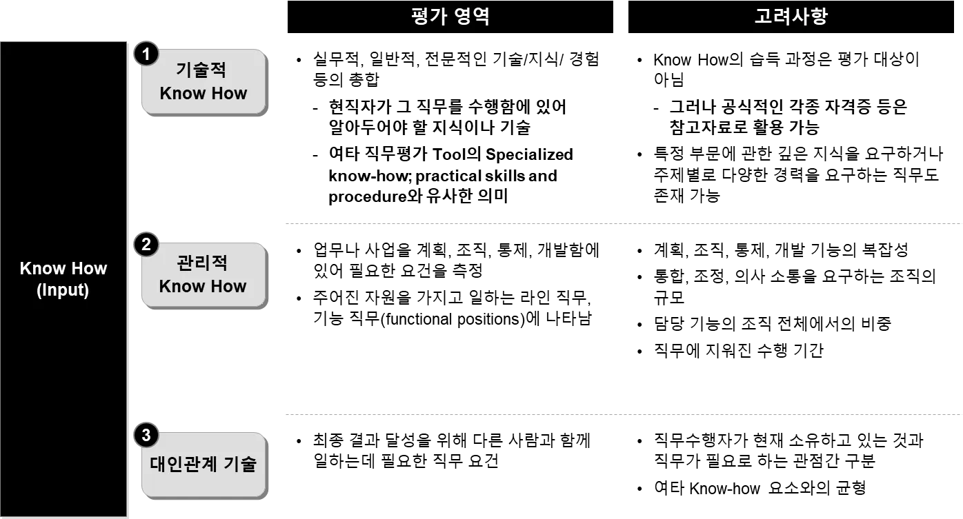 개별 직무에서 요구되는 Know How, Problem Solving 및 Accountability등 세 가지 측면에서 총 8개 기본 요소들의 수준을 측정합니다.
