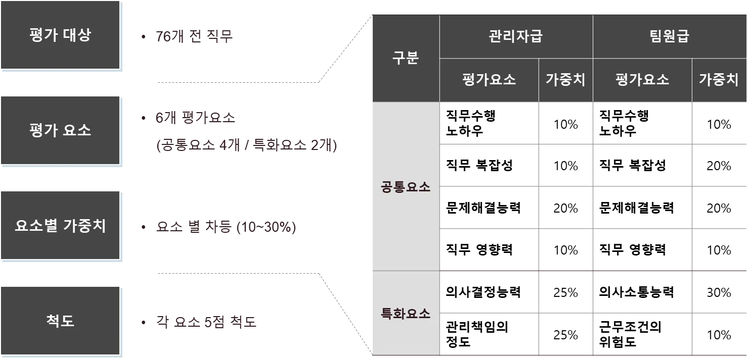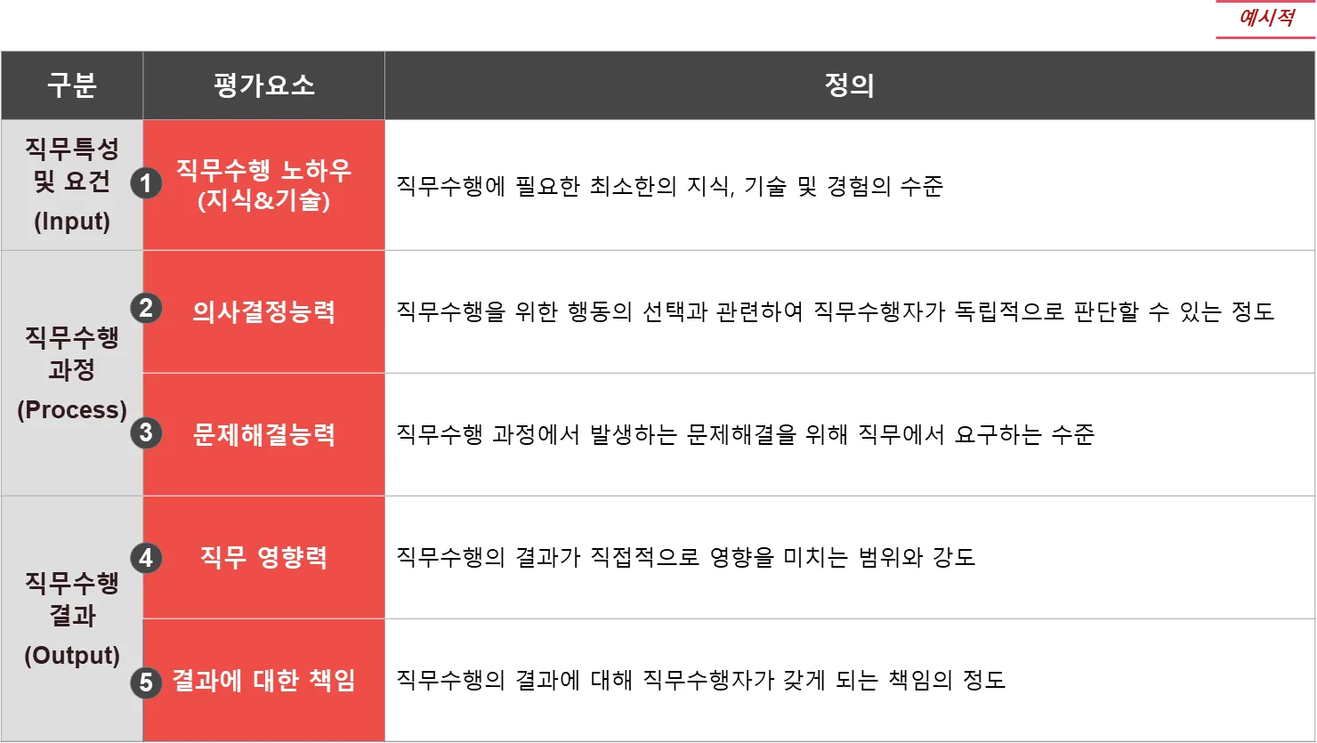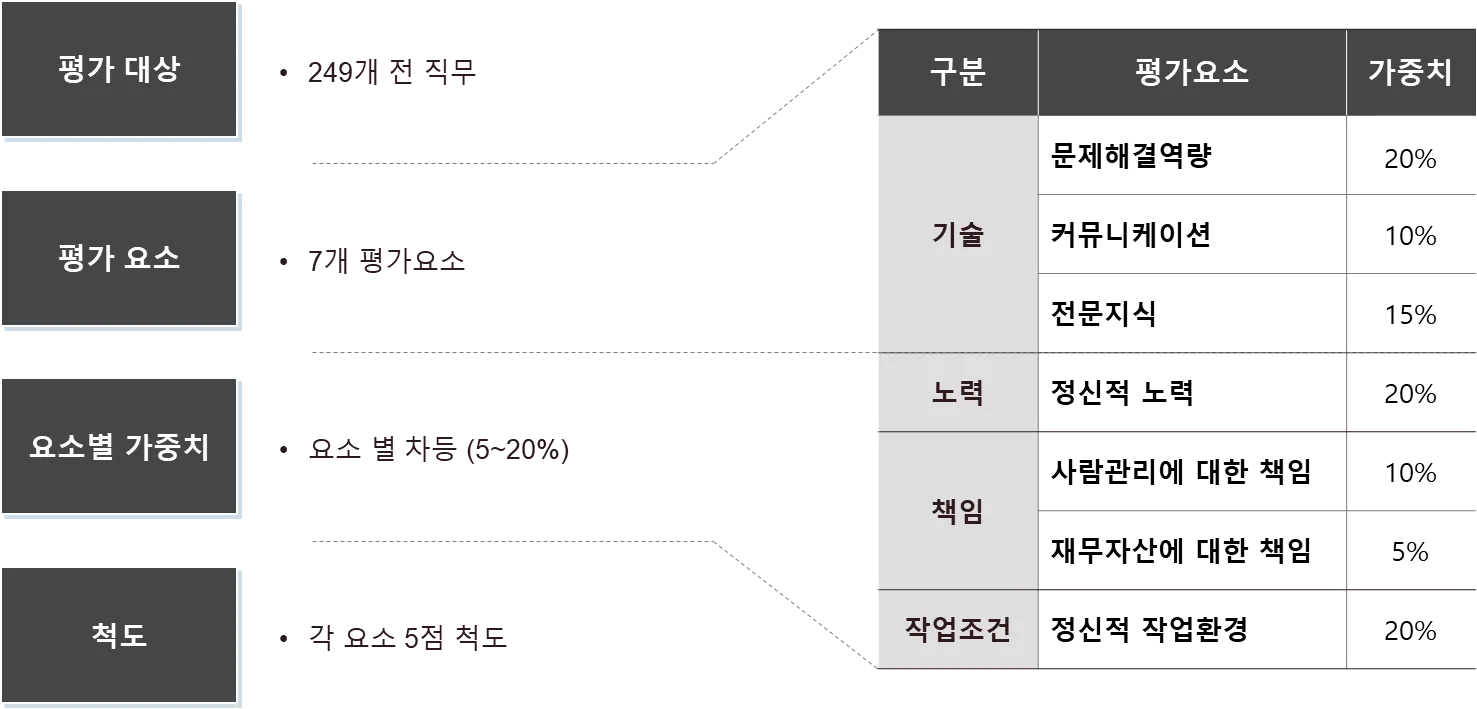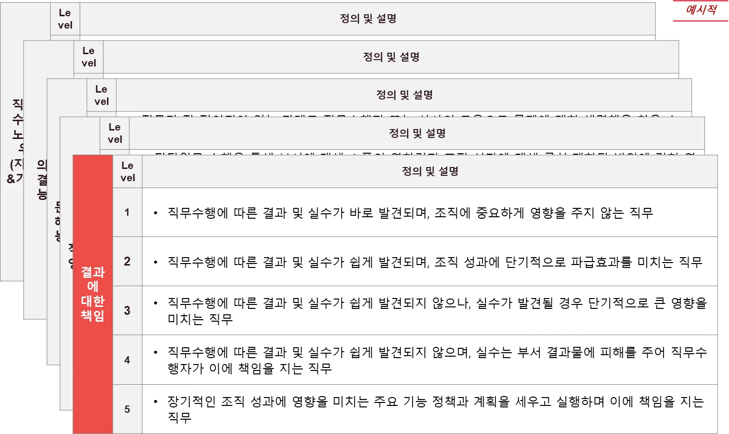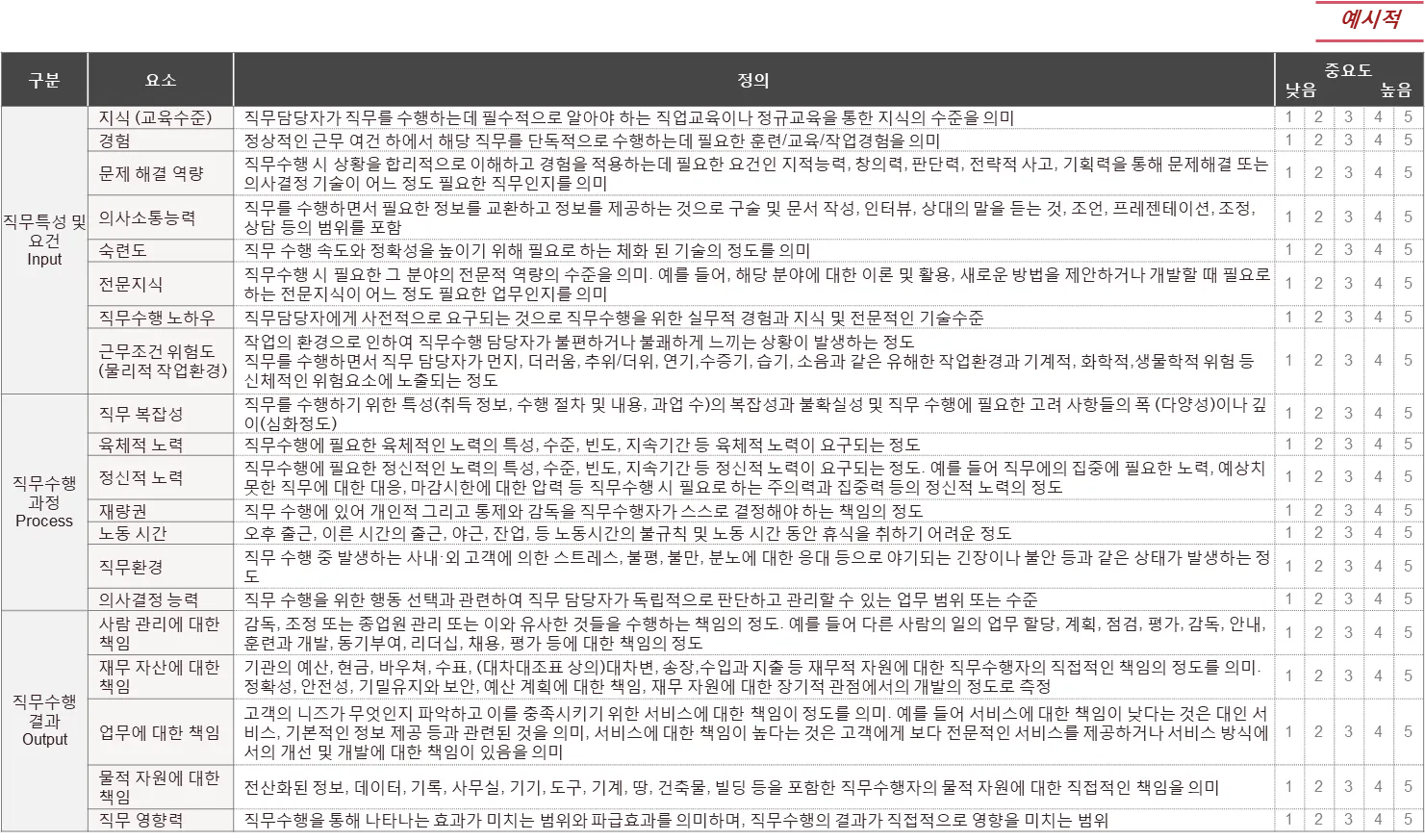 각 직무평가 요소는 평가척도의 정의가 명확하게 설정되어, 평가자가 척도 별 정도의 구분이 가능한 수준이어야 합니다.