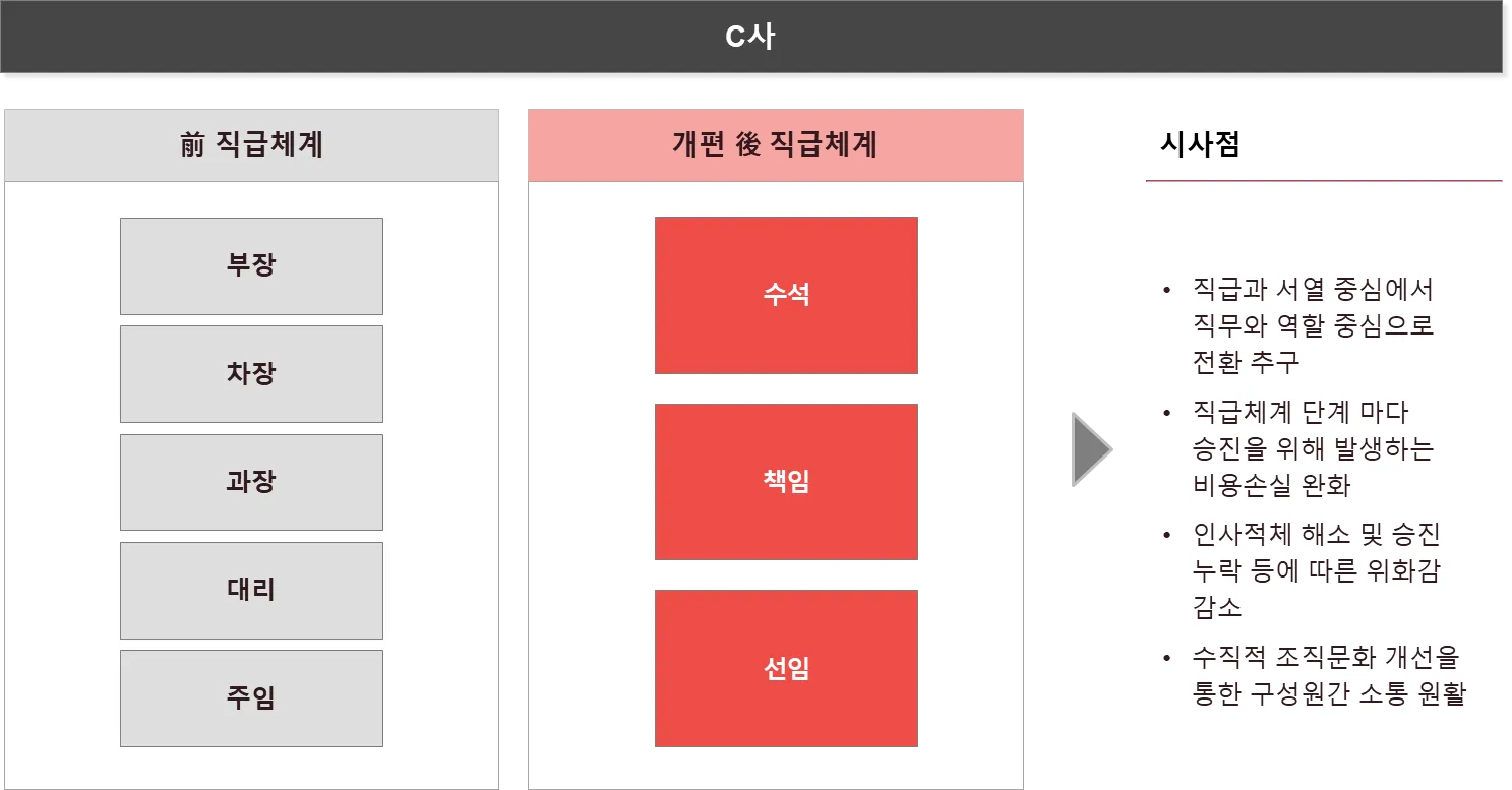 C사는 5단계 직급체계를 3단계로 전환함으로써 직급과 서열 중심에서 직무와 역할 중심으로 전환을 추구하고 있습니다.