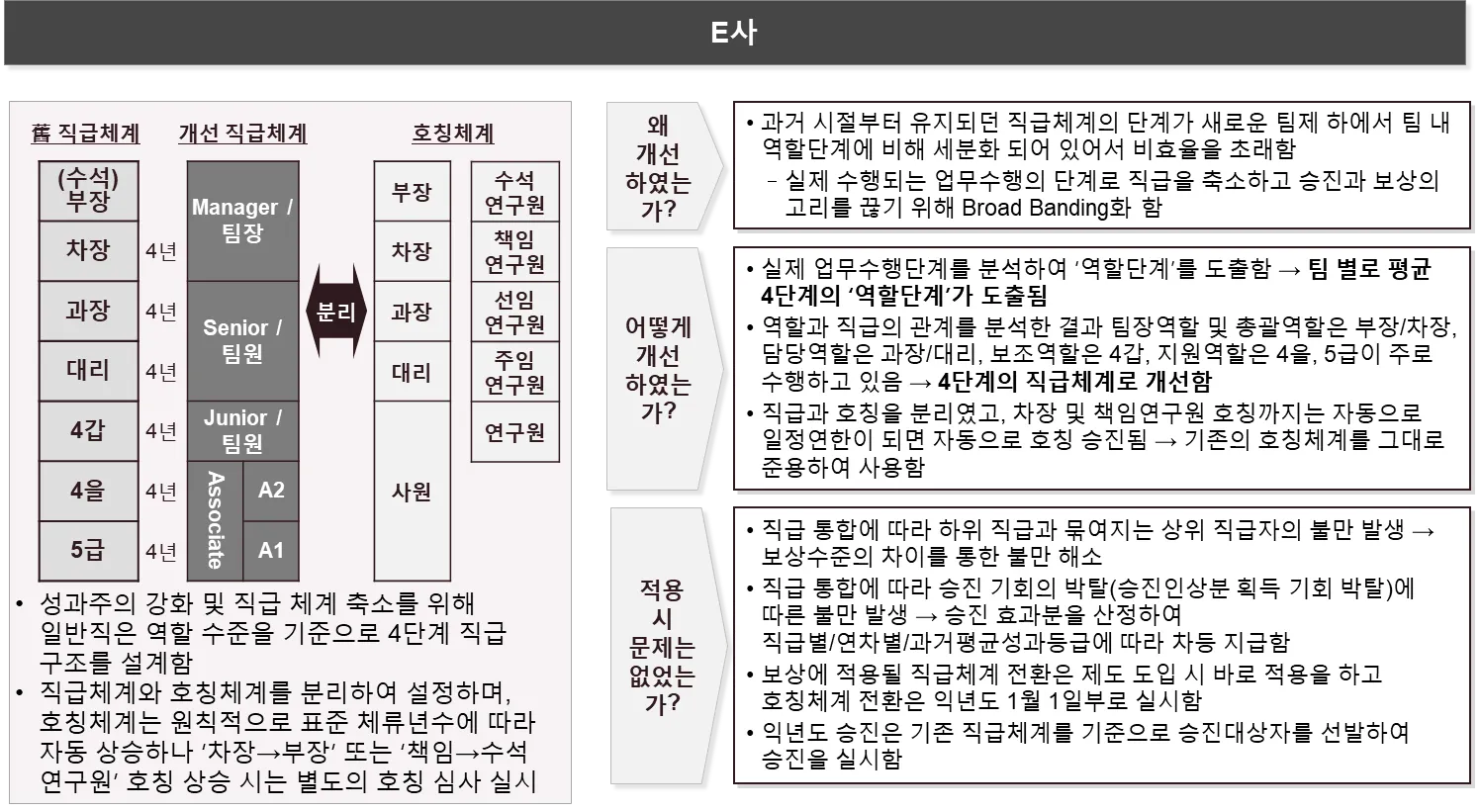 E사는 실제 업무수행단계를 바탕으로 역할단계를 도출하여 4단계의 직급단계를 도출하였고, 직급과 호칭을 분리하여 승진에 대한 부담감을 축소시킵니다.