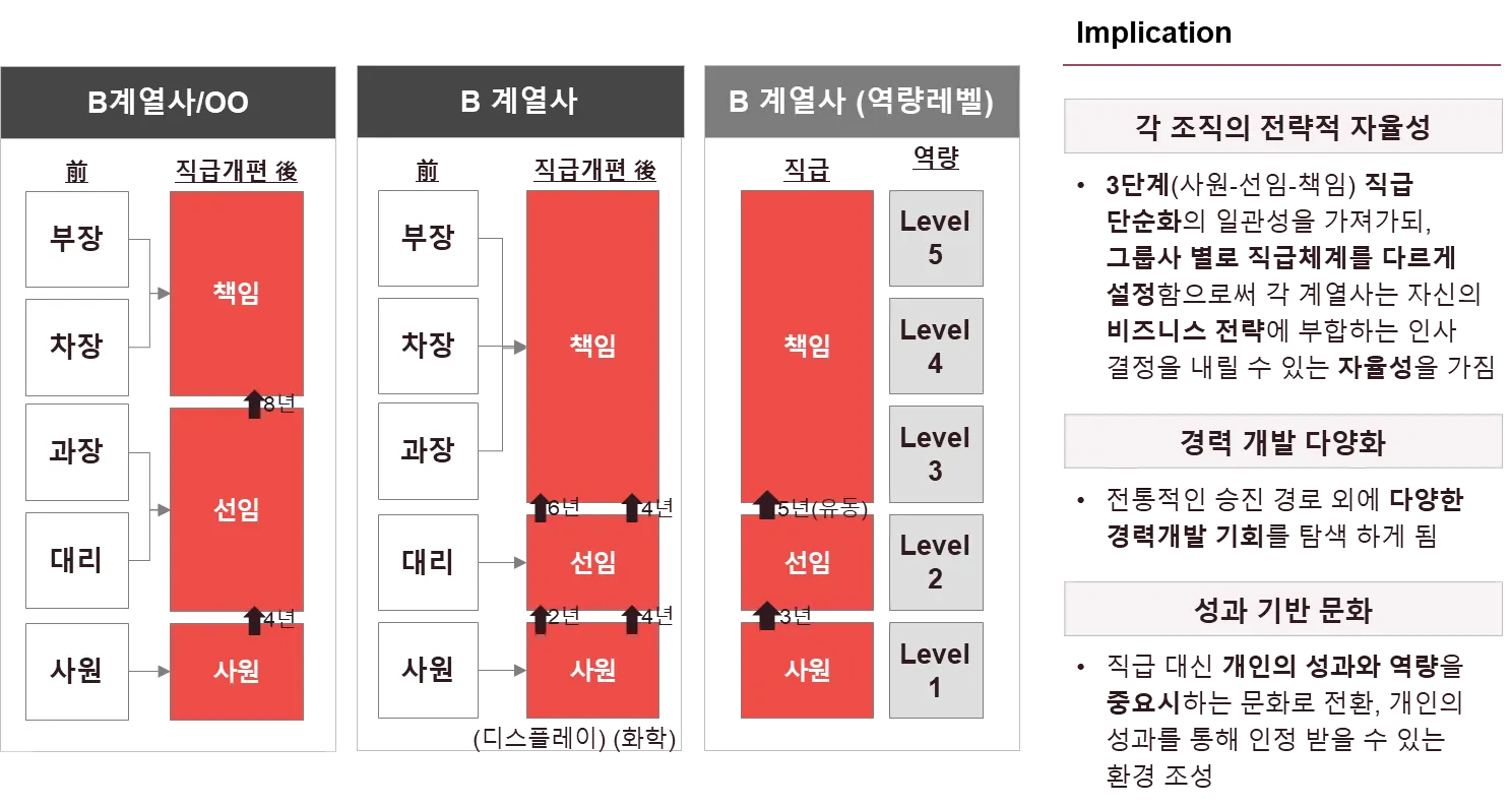 B그룹은 3단계 직급체계 (사원-선임-책임) 구조로 운영하여 그룹 차원에서 통일성과 협력을 유지하되, 각 그룹사 자체적으로 적합한 직급체계를 개발하고 운영하여 인사 관리에 유연성이 있습니다.