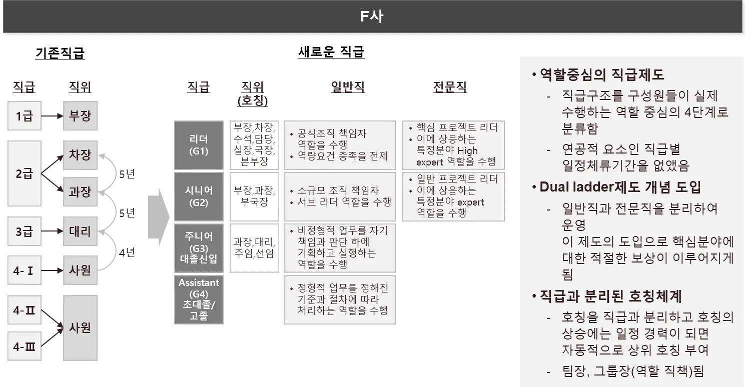 F사는 성과형 신 연봉제를 도입하면서 직급체계를 조직 구성원들이 실제 수행하는 역할 중심의 직급제도로 개편하고 연공적 요소인 직급별 일정체류기간을 없앴으며, 호칭도 역할 직책에 따라 자동적으로 부여하였습니다.