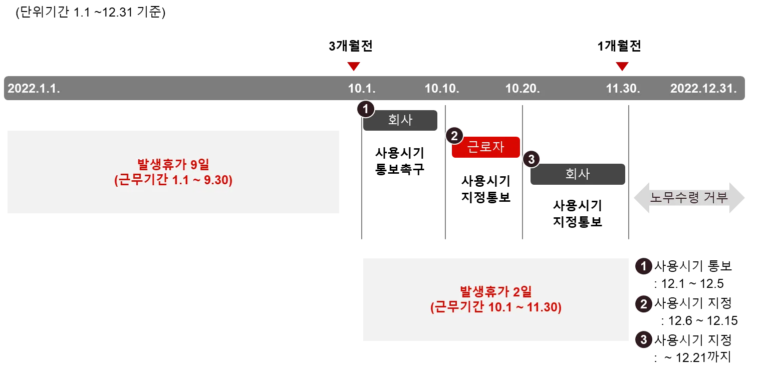 ① 입사 후 2개월 ~ 10개월 차까지 발생한 9일의 연차휴가와 ② 입사 후 11개월 ~ 12개월 차에 발생한 2일의 연차휴가에 대한 촉진 시기가 달라짐을 유의 (아래의 예시는 2022. 1. 1 입사자)
