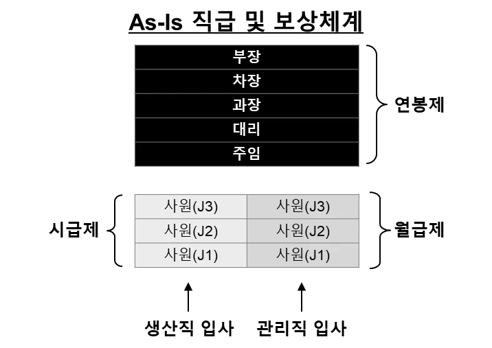 따라서, 현재 생산직이라도 주임 이상은 일반관리직에 준한 급여체계를 적용하고 있어 혼란 및 불만을 발생시킴