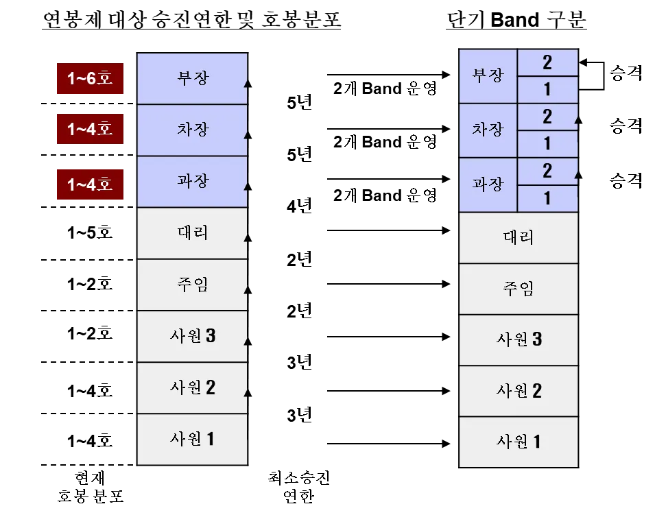 관리직 8개 직급을 그대로 유지한 채 부장,차장,과장 직급은 체류년수를 고려하여 2개의 Band로 구분하여 운영