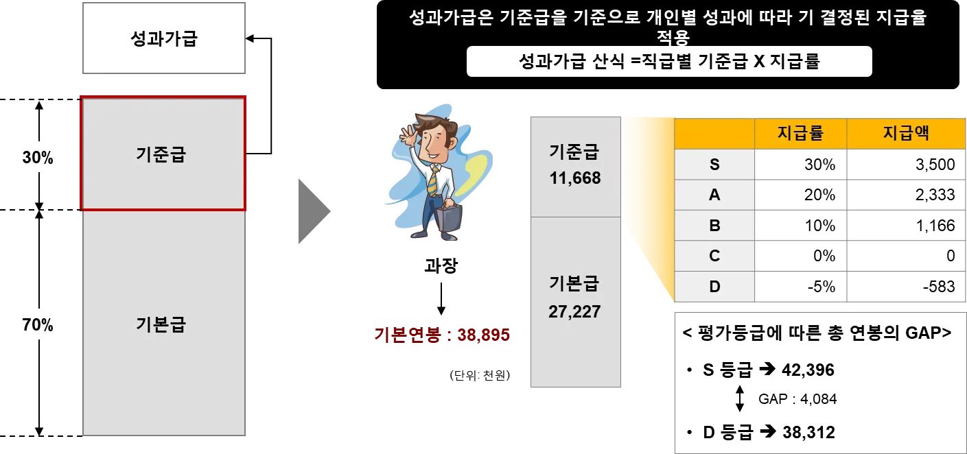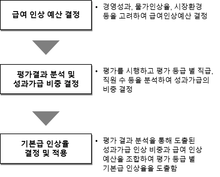 운영방식 | _ 성과에 상관없이 기본연봉 수준은 매년 상승하게 되고, 성과가급을 통해 그 해 성과에 따른 금액을 지급하는 방식 | _ 직급별 기본급은 고정해서 지급