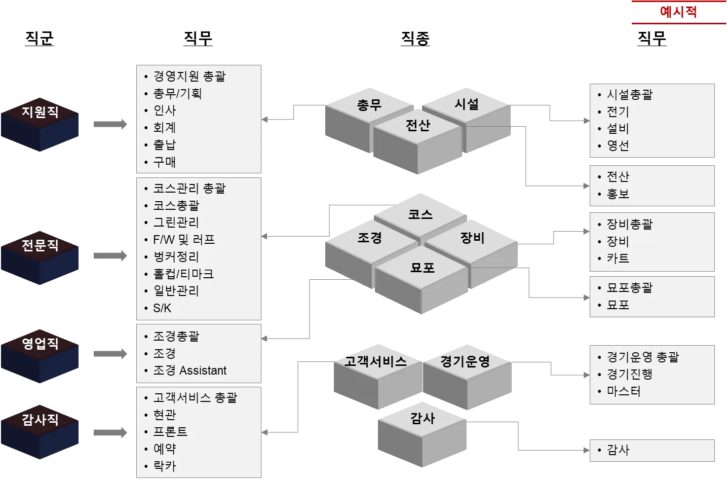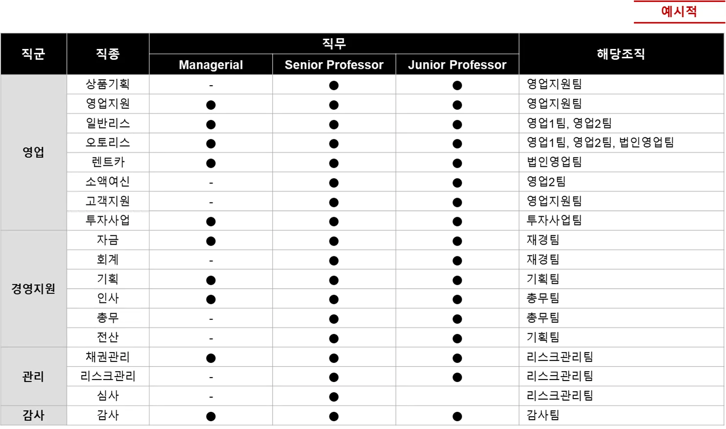 직무 수행 기능의 유사성, 직무 수행 시 요구 역량의 유사성, 경력경로의 유사성, 현 조직구조 측면 등을 고려하여 직군 내 직종을 분류 합니다.