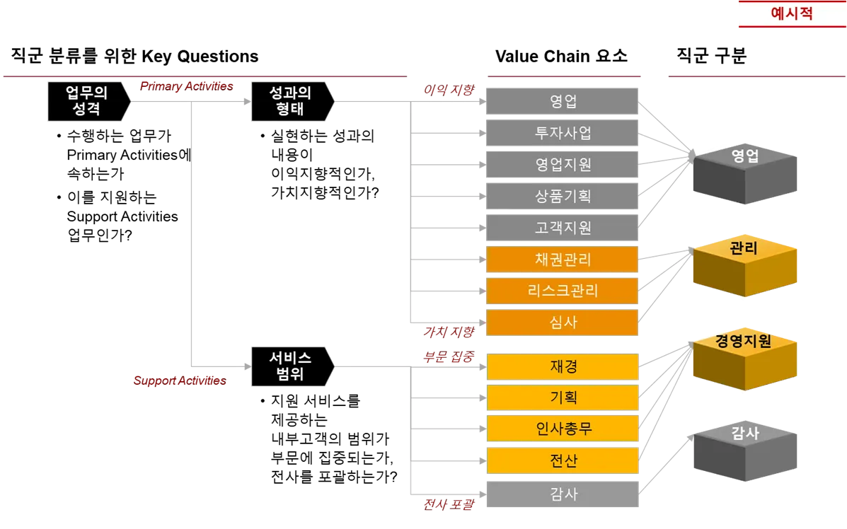 각 Value Chain을 업무/성과 형태/서비스 범위의 기준으로 분류하여 직군을 구분합니다.