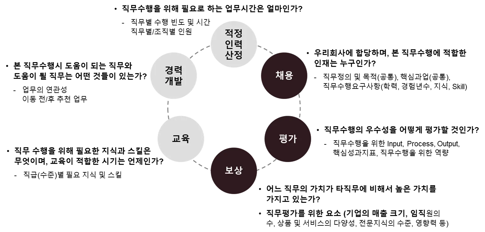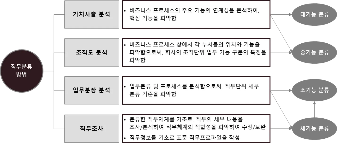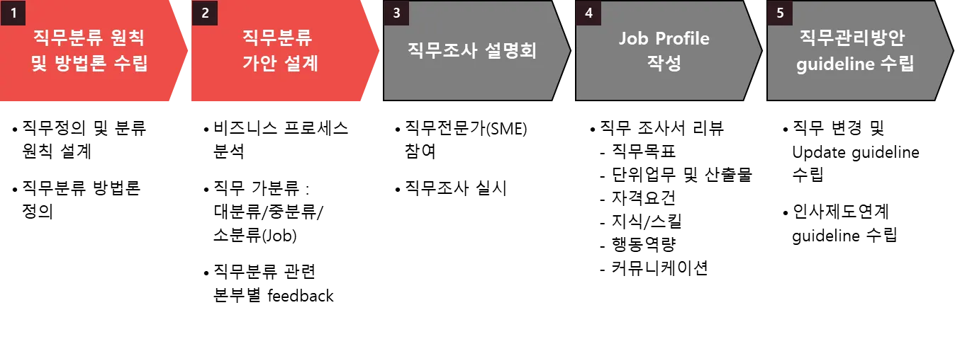 이번 컨텐츠에서는 직무분류 원칙 및 방법론 수립, 직무분류 가안 설계에 대해서만 다룰 예정입니다.